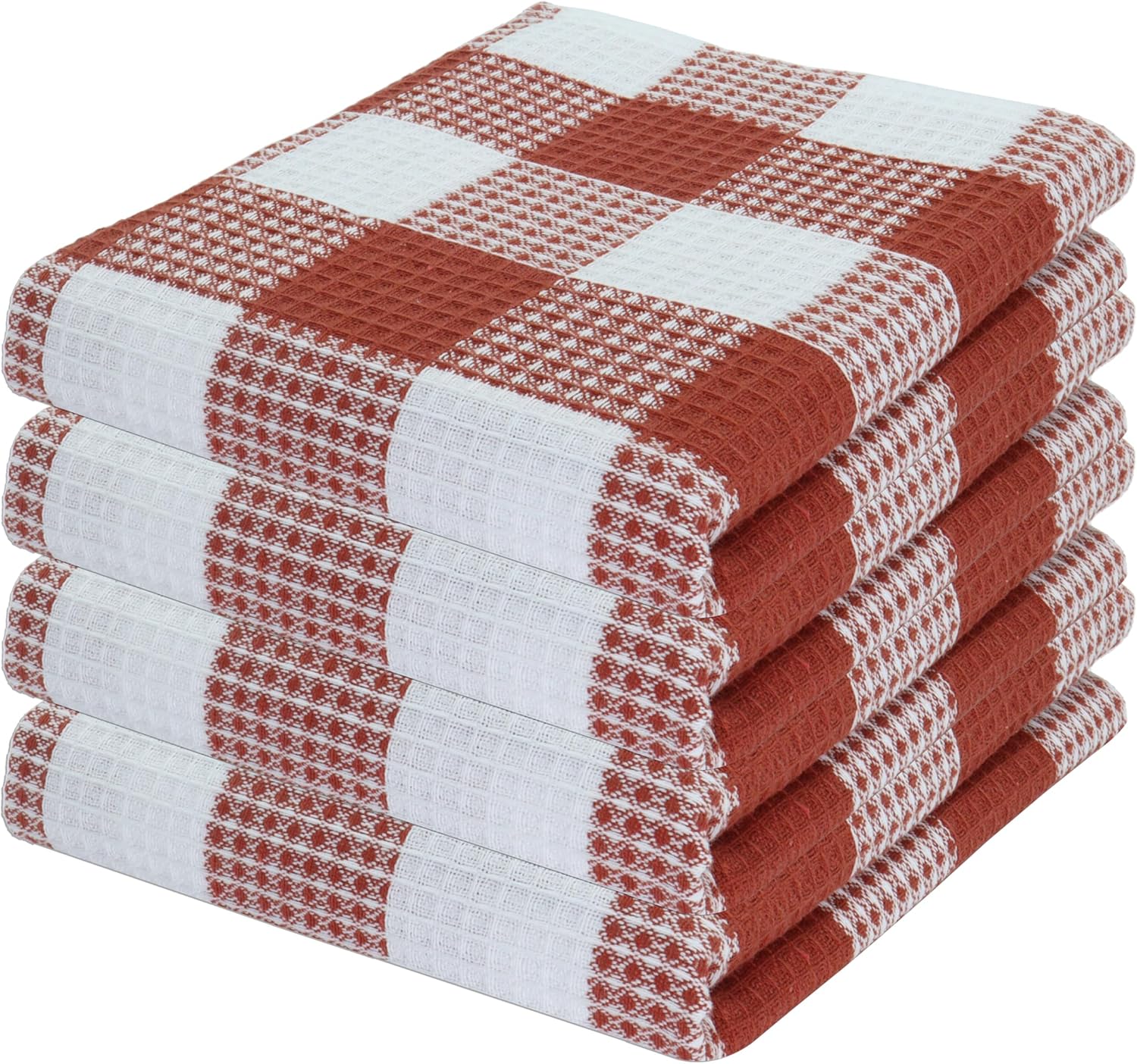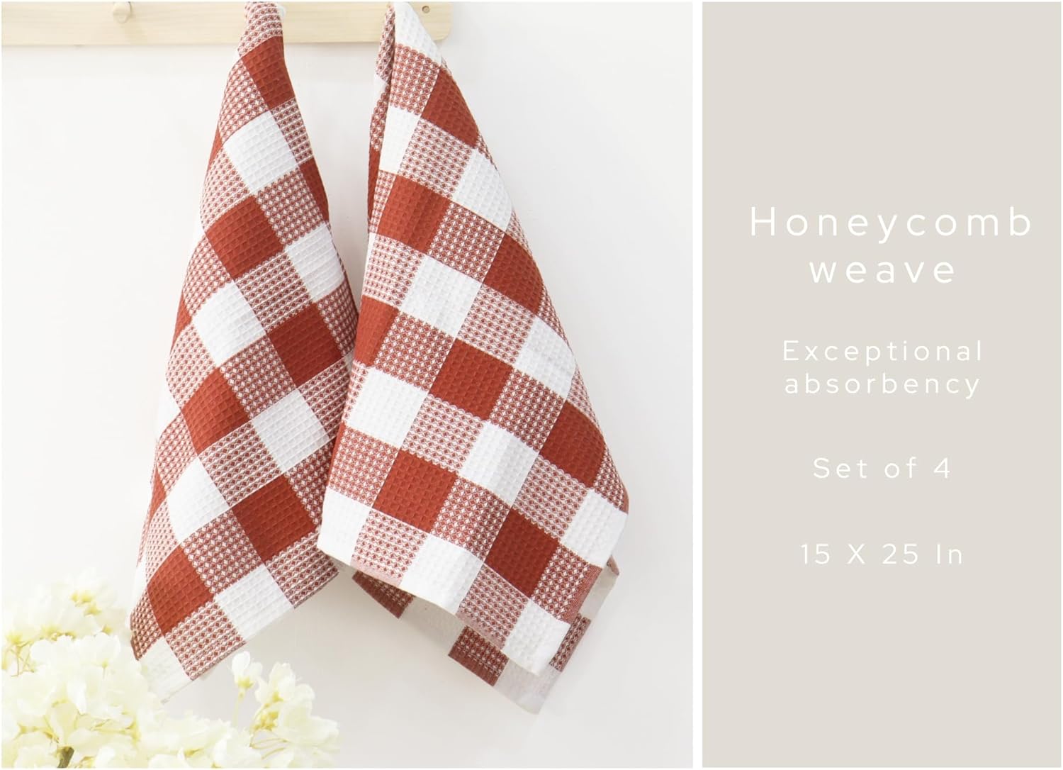 PurpleEssences Rust 100% Cotton Waffle Weave Check Plaid Kitchen Towels, Super Soft and Absorbent Dish Towels for Drying Dishes 15 x 25-4 Pack - Spring Summer - Rust and White