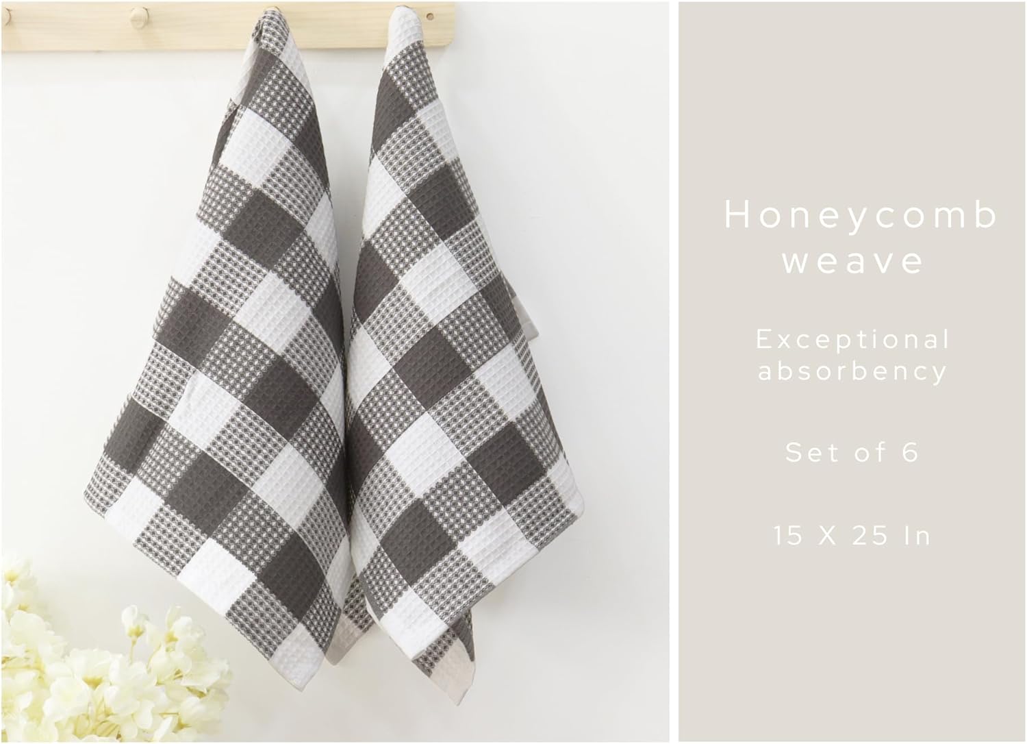 - Pack of 6 Waffle Weave Dish Towels measuring 15 by 25 Inches.