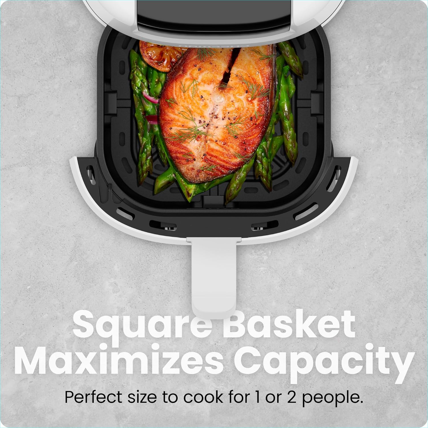 - SUPREME SPACE-SAVER: The square basket maximizes its 2-quart capacity. Housed in a sleek, narrow design to keep its countertop footprint small, this airfryer eliminates clutter and extraneous appliances.