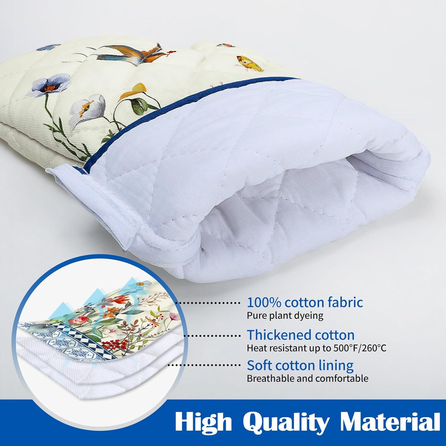 Retro Wildflowers Oven Mitts and Pot Holders Sets 100% Cotton Heat Resistant, Extra Long Oven Gloves Potholder for Kitchen Cooking Baking Housewarming