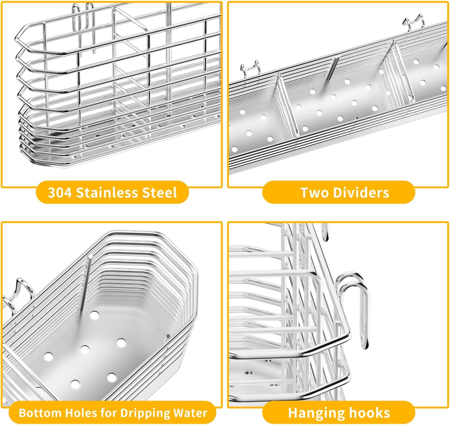 JAQ Utensil Holder for Sink, Sus304 Stainless Steel Rust Free Silverware Cutlery Flatware Holder Rack Organizer with Hooks for Dish Drying Rack Sink Dish Drainer in Kitchen Bathroom