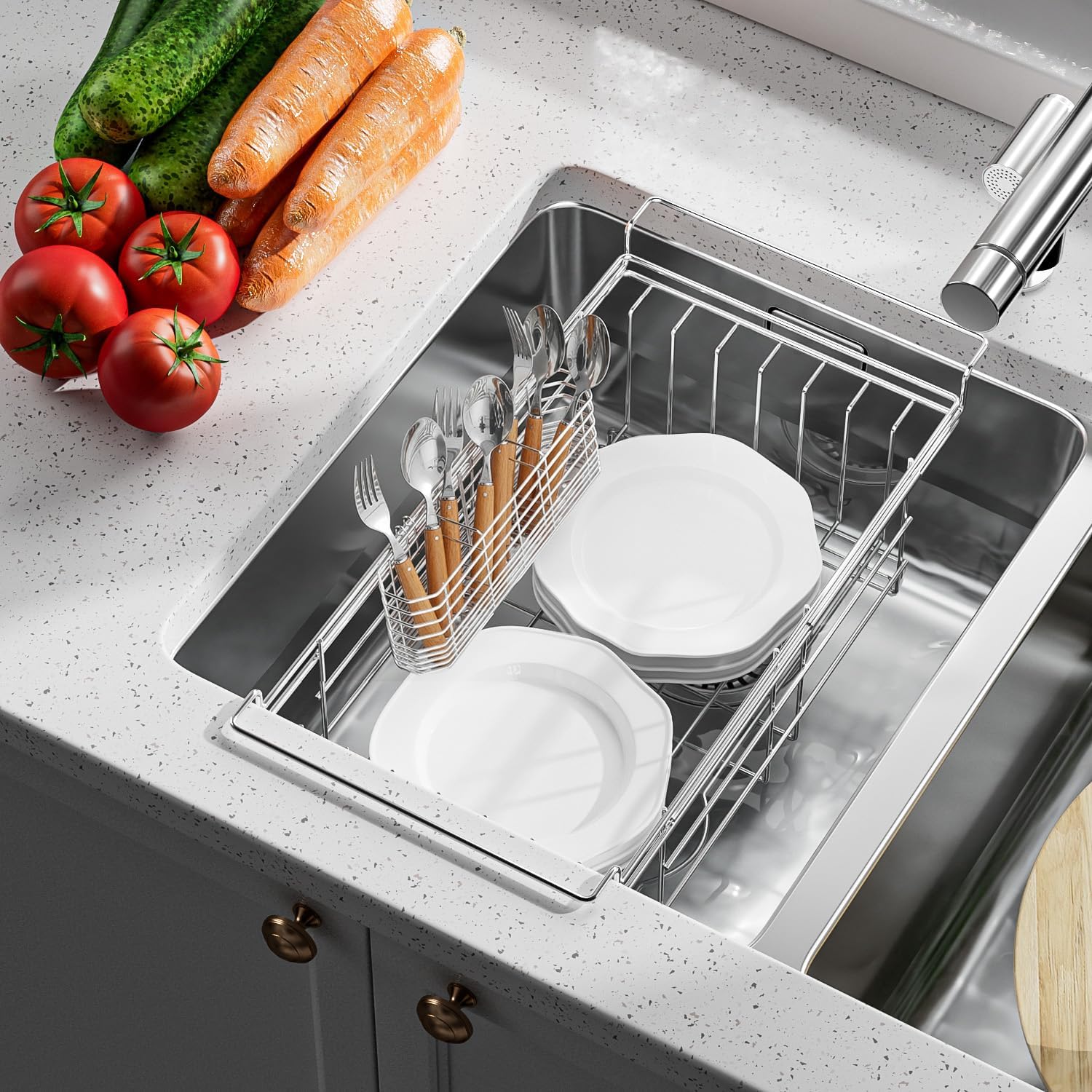 - √ 【Keep your Silverware well-organized 】304 Stainless steel drying basket holds utensils, such as spoons, forks and knives where you need them. Keep countertops clear, no more mess around the sink.