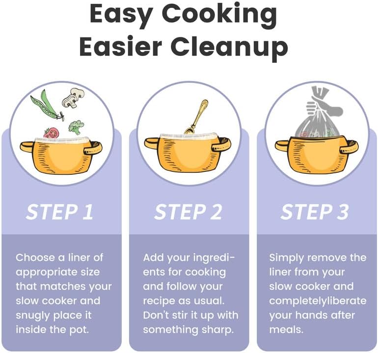 - 【Easy to Use】One pack, each pack contains 10 slow cooker liners, sized 8"x11", stacked individually in a resealable bag for easy single-sheet use. Just line your slow cooker, cook, and toss for a No-hassle clean-up