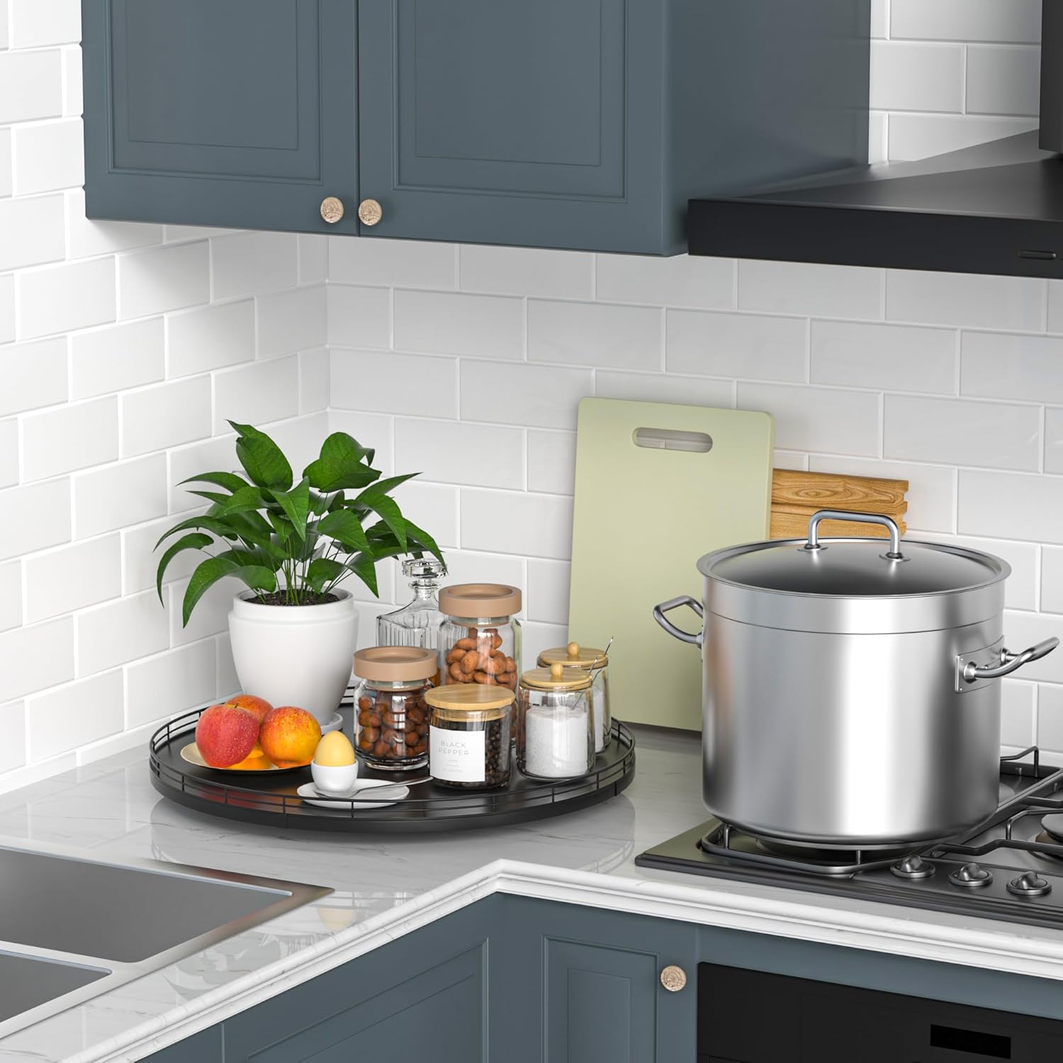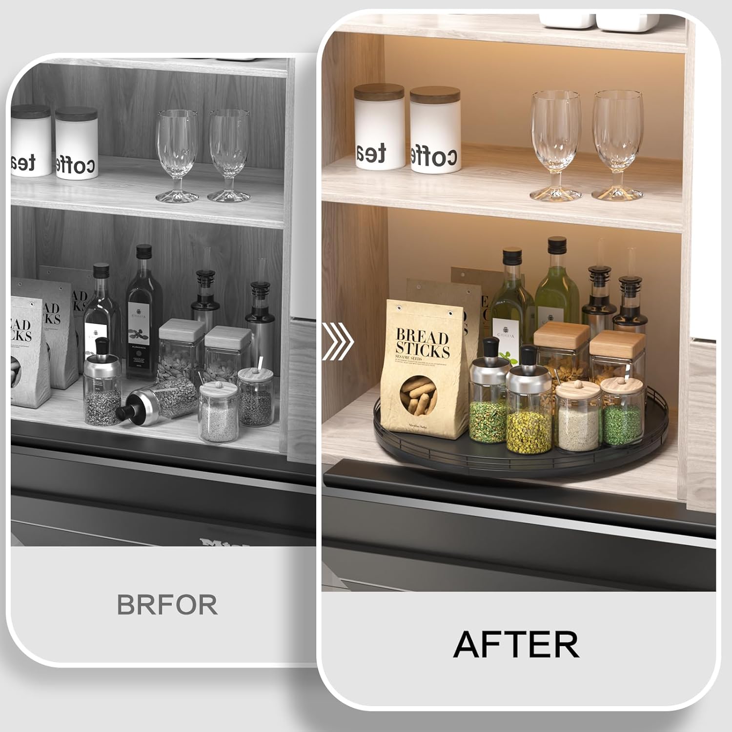 - ๐ง๐ต๐ผ๐๐ด๐ต๐๐ณ๐๐น ๐๐ฒ๐๐ถ๐ด๐ป: The turntable tray features a smooth and silent 360ยฐrotation; Bottom slip-resistant pads for stability and protect your countertop from scratches; Raised edges on each organizer tray to keep items from falling out; Easy to use, no installation required
