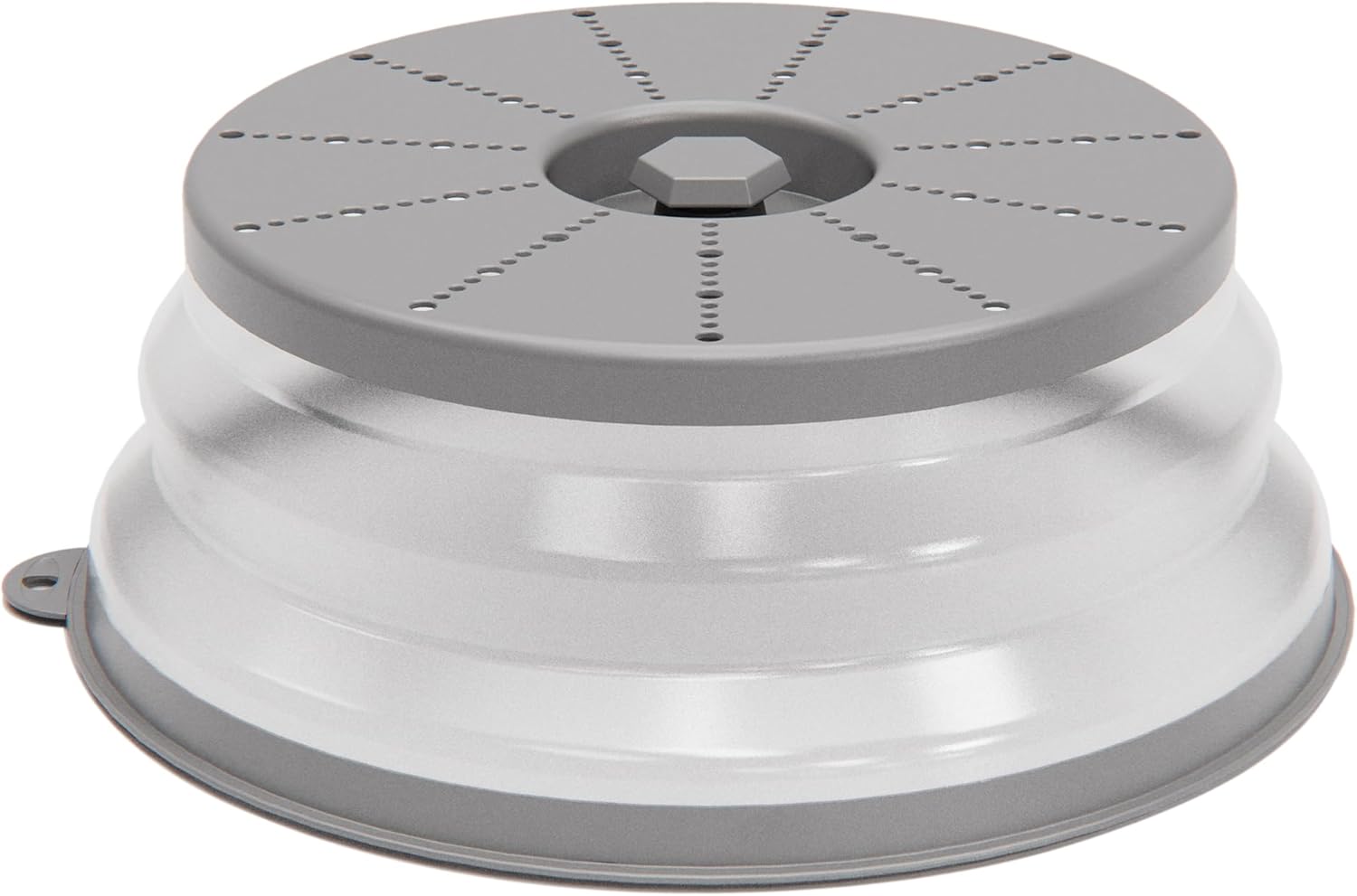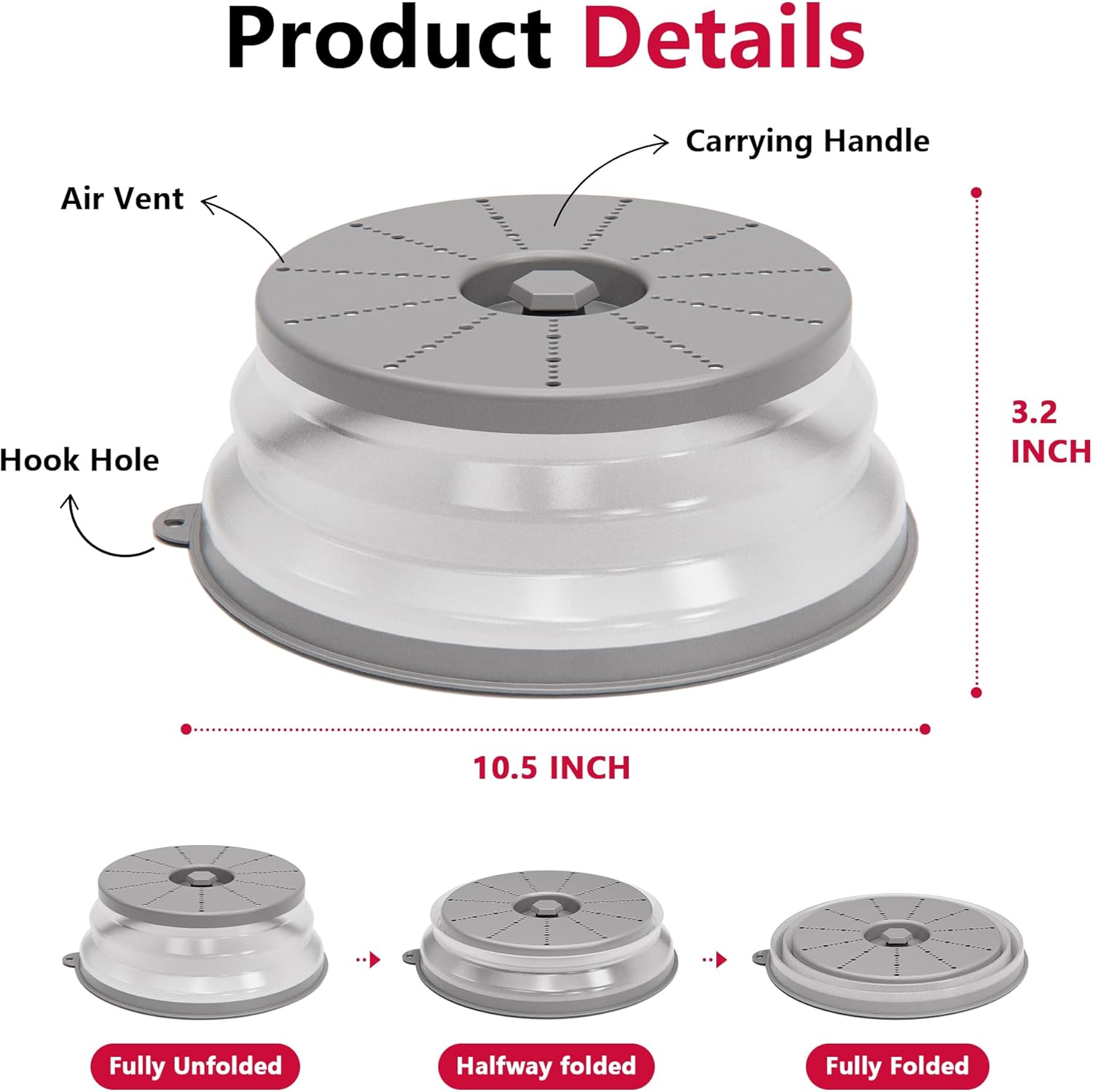 - Microwave Cover: The collapsible microwave cover promotes even cooking and features a vented lid to keep your microwave clean. It measures 10.5 inches by 3.2 inches and fits over most plates and bowls.