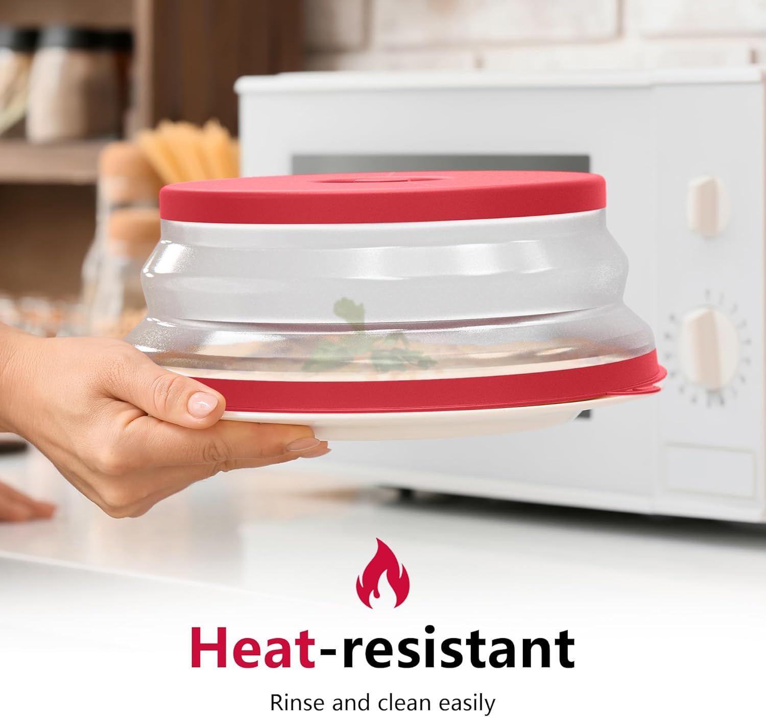 - Microwave Cover: The collapsible microwave cover promotes even cooking and features a vented lid to keep your microwave clean. It measures 10.5 inches by 3.2 inches and fits over most plates and bowls.