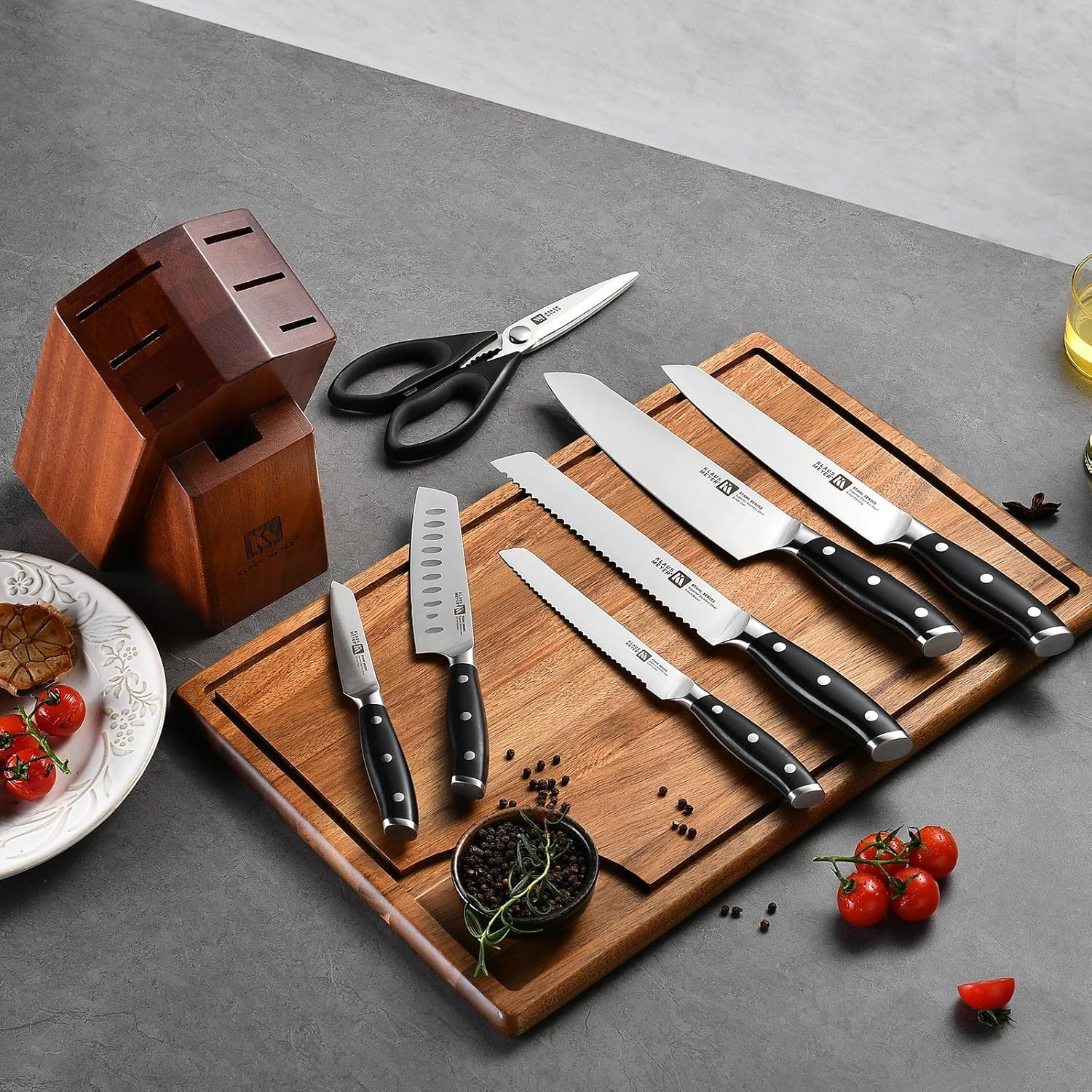 - 【8 in 1 Knife Block Set】STAHL 8 pieces knife block set, an affordable and practical starter knife set to your kitchen, meets everyday kitchen tasks including cutting, slicing, chopping, dicing, and mincing, suitable for processing all ingredients such as meats, fish, fruits, vegetables and bread with a range of useful knives choices consisting of 8" Chef's Knife, 8" Bread Knife, 8" Carving Knife, 6" Utility Serrated Knife, 5.5" Santoku Knife, 3.5" Paring Knife and Solid Wooden Block.