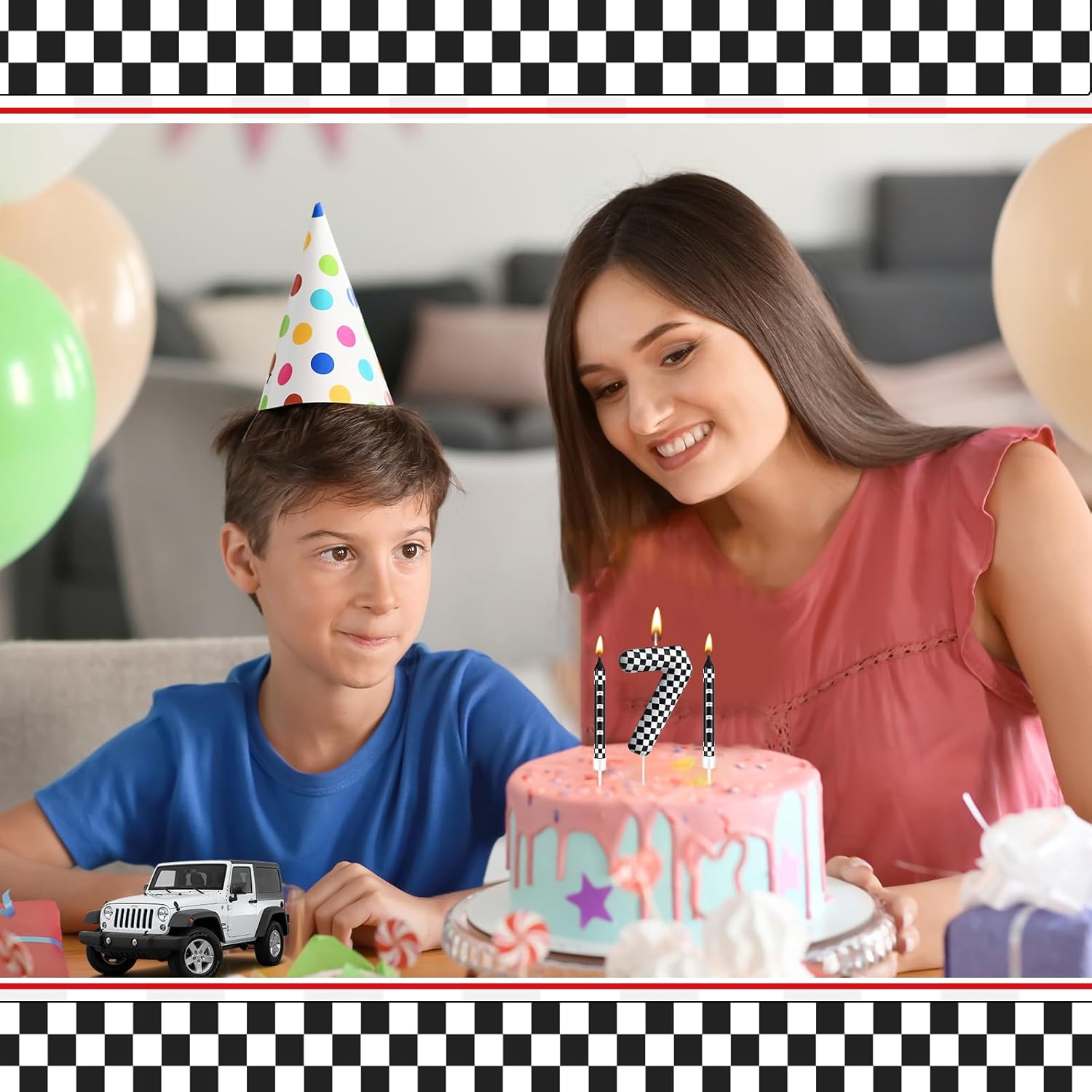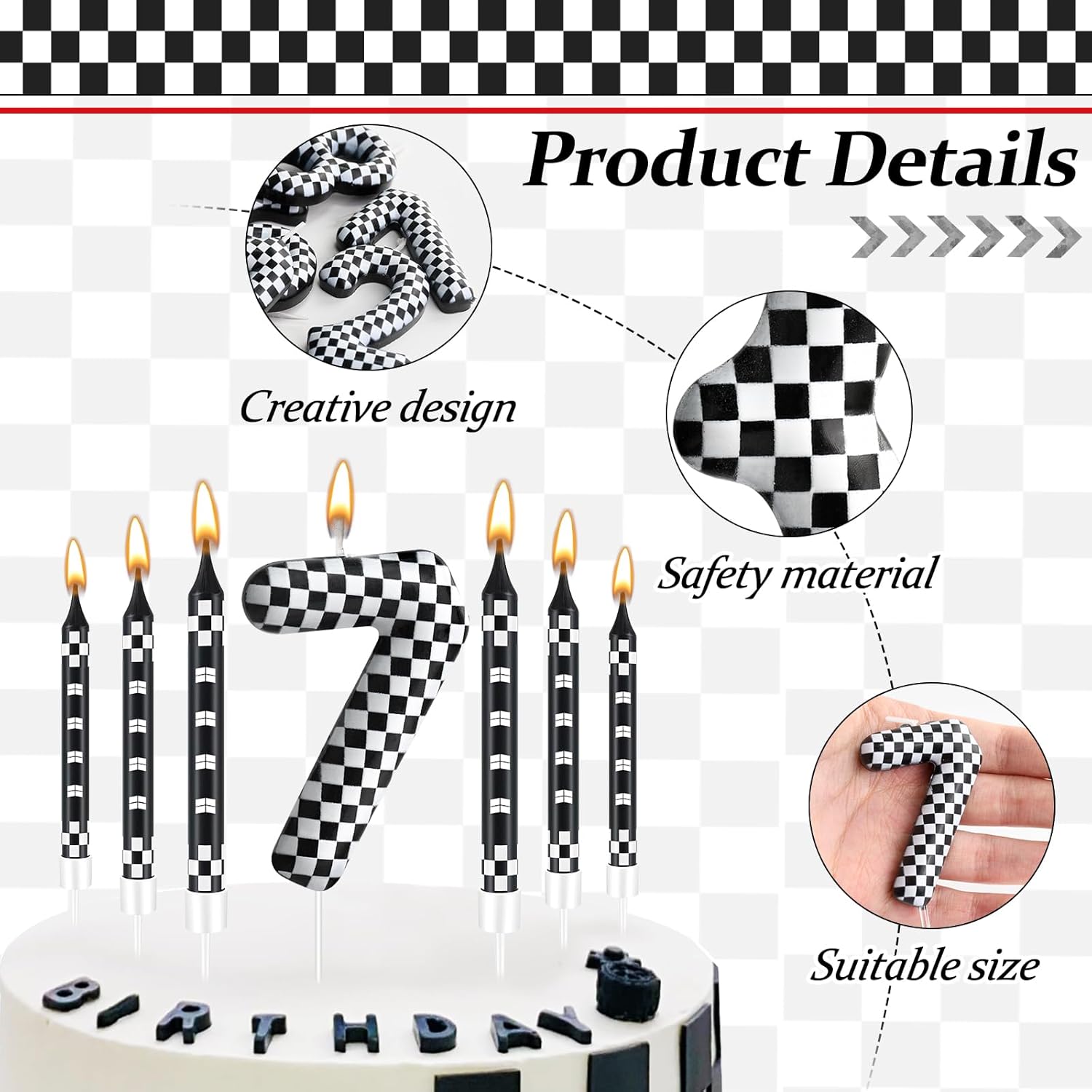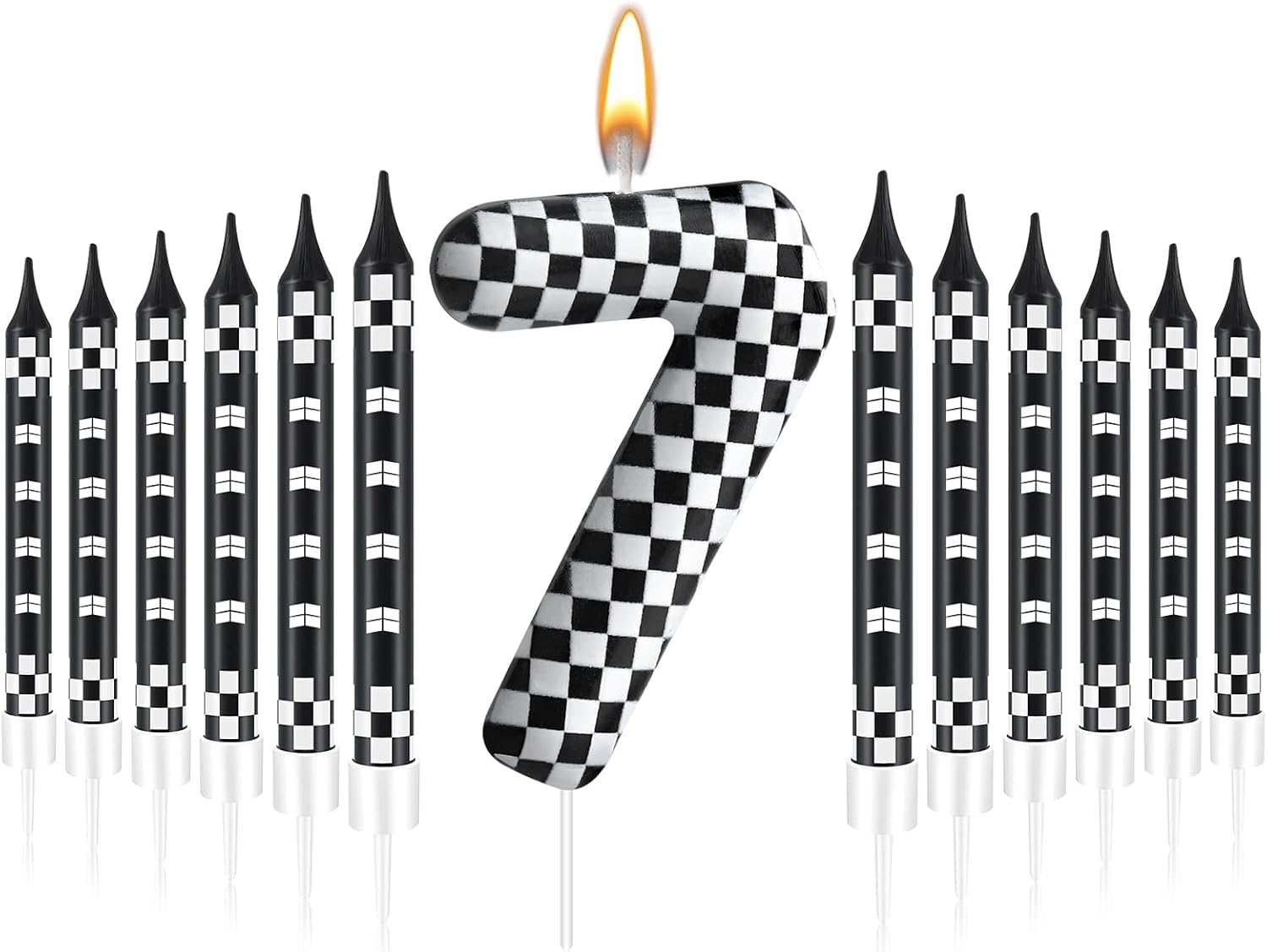 - The Package Includes: You will receive 12 black and white track car themed birthday candles and 1 number 7 black and white checkered candle, Sufficient quantity for birthday cake decoration or party celebration and daily use, note: the candle will slowly melt as it burns, and it is recommended not to leave it on the cake for more than two minutes