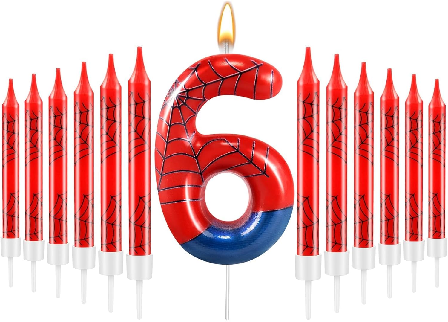 - The Package Includes: You will receive 12 red spider themed birthday candles and 1 number 6 candle, enough for all kinds of party celebrations and everyday use to create a fantastic birthday cake, note: the product may have a color difference, but it does not affect use, the candle will slowly melt as it burns, and it is recommended not to leave it on the cake for more than two minutes