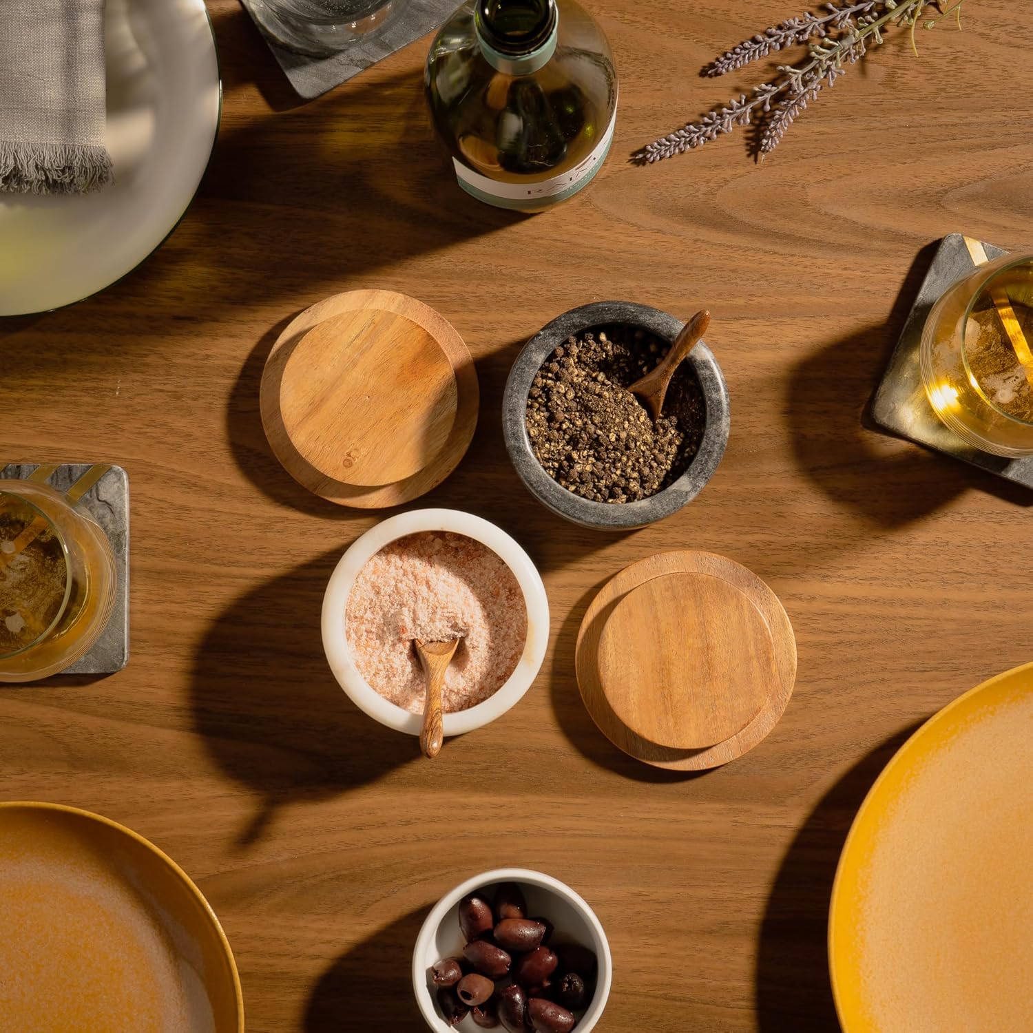 Cork & Mill Grey Marble Salt Cellar with Acacia Wood Lid and Spoon - Elegant Modern Salt Container for Countertop - Handcrafted Pepper Pot - Wide 4” Pepper Holder with Non-Skid Feet