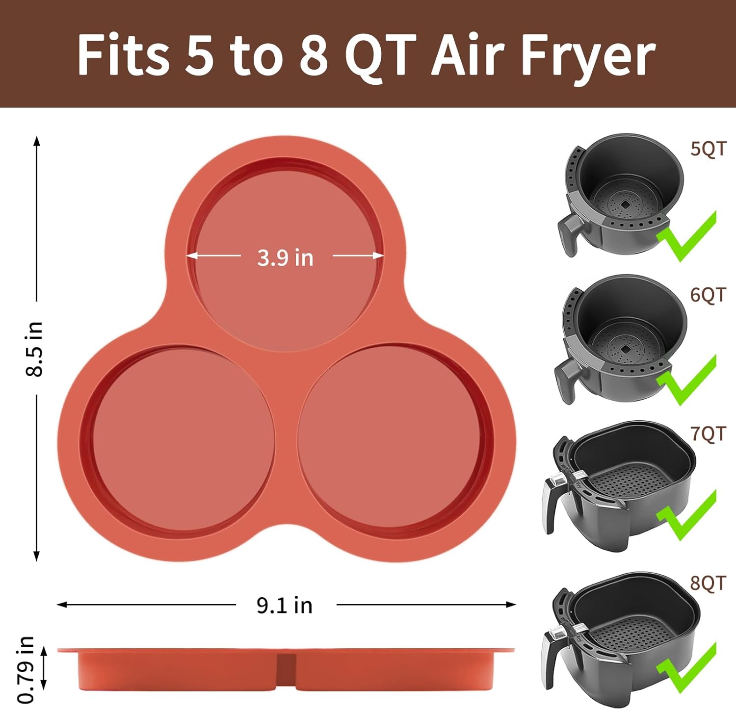 - Wide Compatibility: 9 inch wide silicone pancake pans are suitable for 5QT-8QT air fryers and above. In addition, this versatile baking mold is heat range from -40°F to +446°F, ok to use in ovens, instant pots, microwaves, etc
