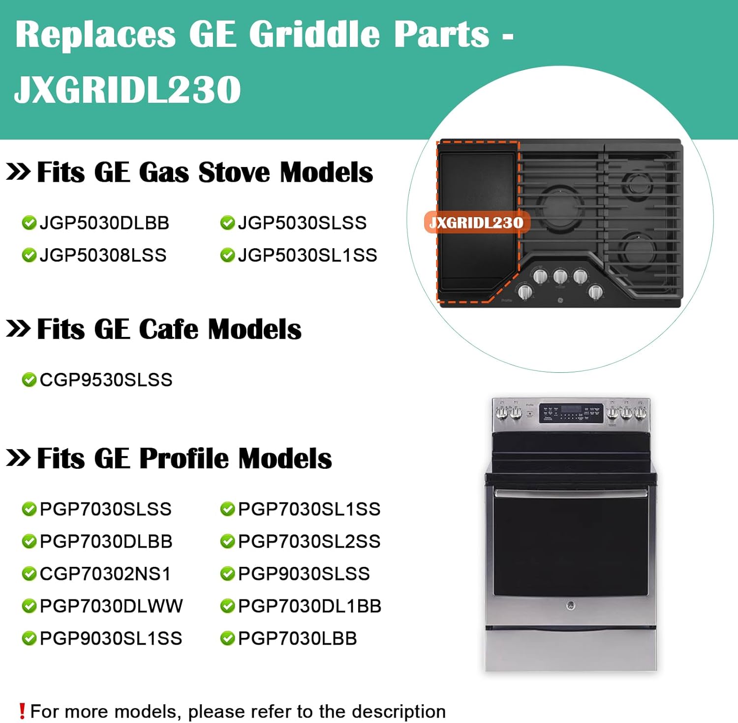 - ► Fits GE Gas Stove Griddle Replacement - GE JGP5030DLBB, JGP5030SLSS, JGP50308LSS, JGP5030SL1SS. ► Fits GE Profile Griddle Models - GE Profile PGP7030SLSS, PGP7030SL1SS, PGP7030DLBB, PGP7030SL2SS, CGP70302NS1, PGP9030SLSS, PGP7030DLWW, PGP7030DL1BB, PGP9030SL1SS, PGP7030LBB. ► Fits GE Cafe Griddle Models - GE Cafe CGP9530SLSS.