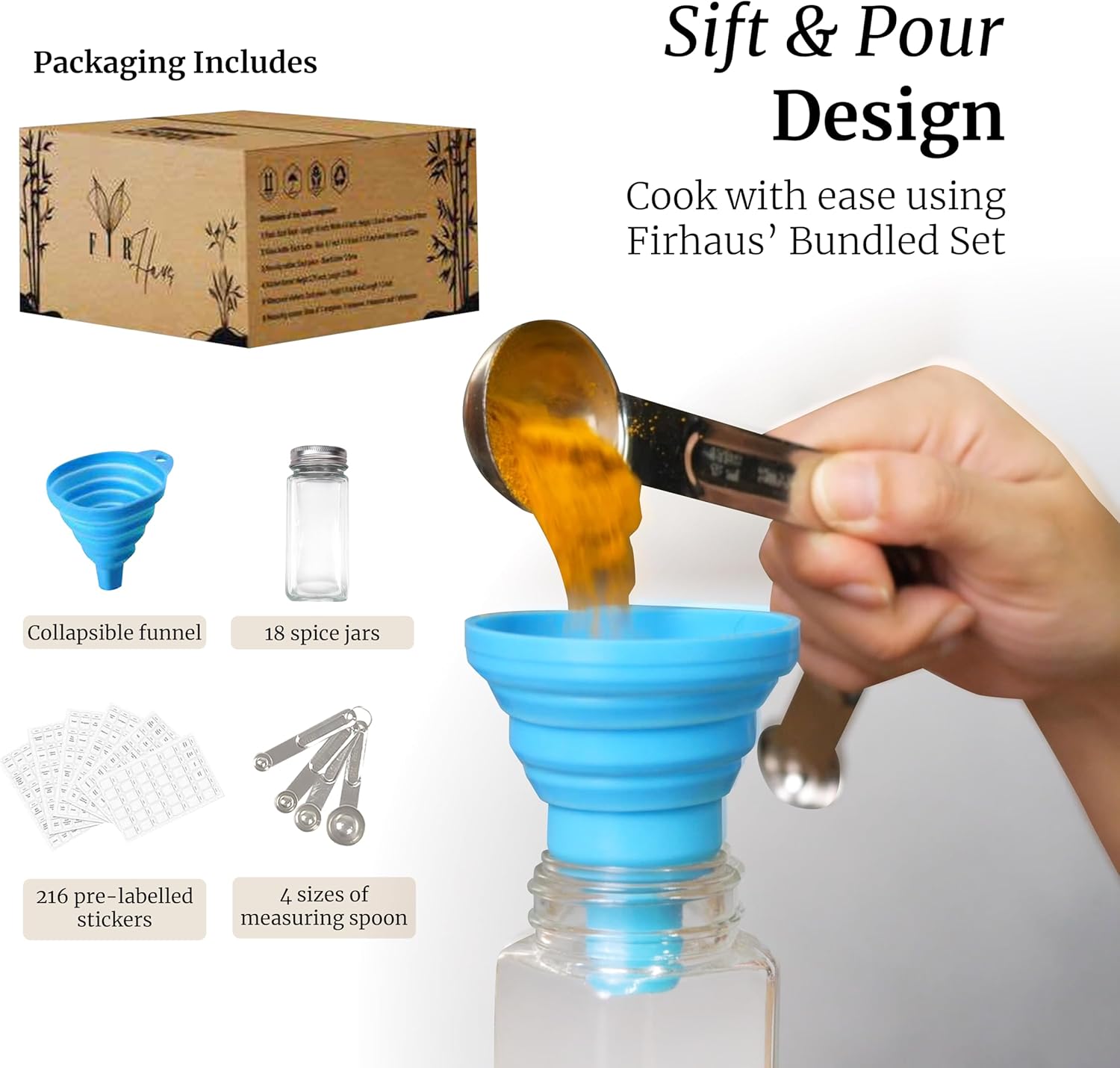 - [Practical Housewarming Gift] Spice Drawer Organizer with Jars and Labels would be thoughtful as a gift. Included 18 spice jars with label, 216 spice labels, 4 measuring spoons, funnel, non-slip pads.