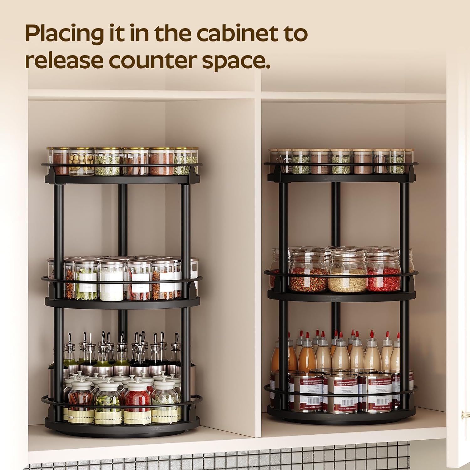 - Capacious Space: Sizing 10.2"L x 10.2"W x 18"H, this lazy susan organizer is divided into 3 layers for layered and partitioned storage to help eliminate clutter. 7.5" layer spacing design facilitates accommodating bottles of different heights