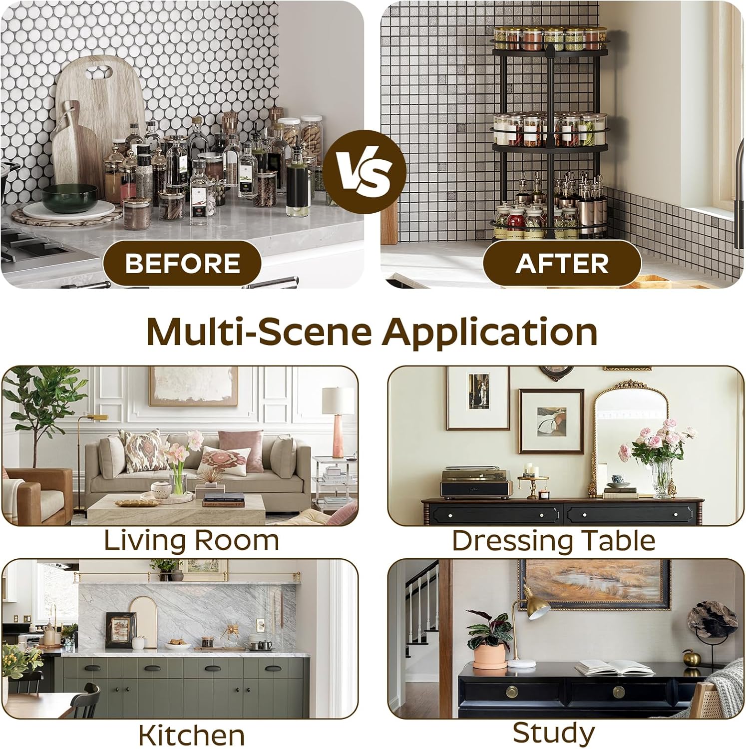 - Reduce Countertop Pressure: Place the lazy susan on the kitchen countertop to keep spice jars handy and the cooking area less messy. Use it on a dressing table to store your favorite cosmetics or on a dining table to easily locate your preferred spices