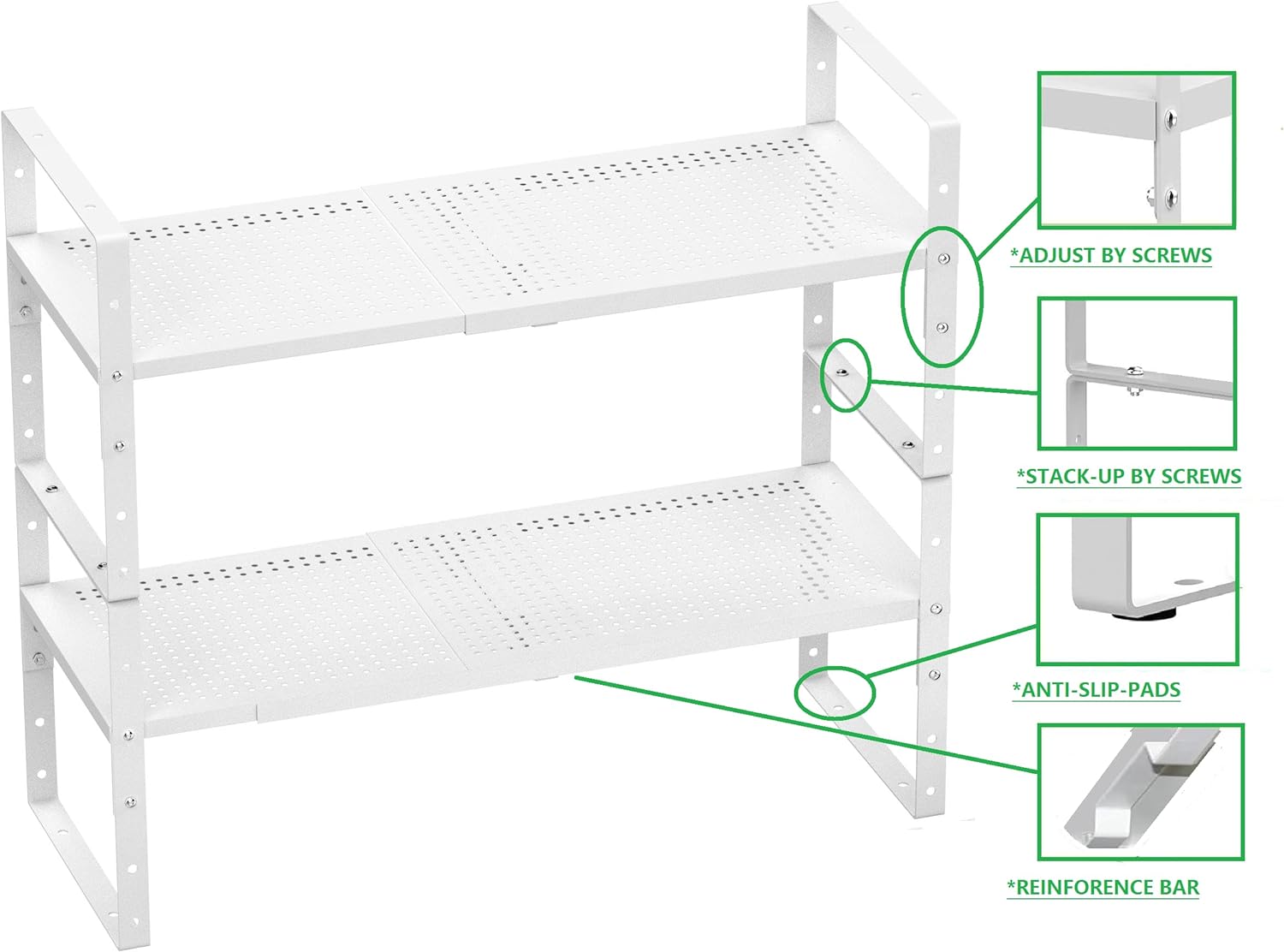 Expandable Shoe Rack Stackable Metal Pantry Storage Shelves Stand Adjustable Height Cabinet Shelf Organizer Racks Spice Shelving(2PACKS/WHITE,MEDIUM)