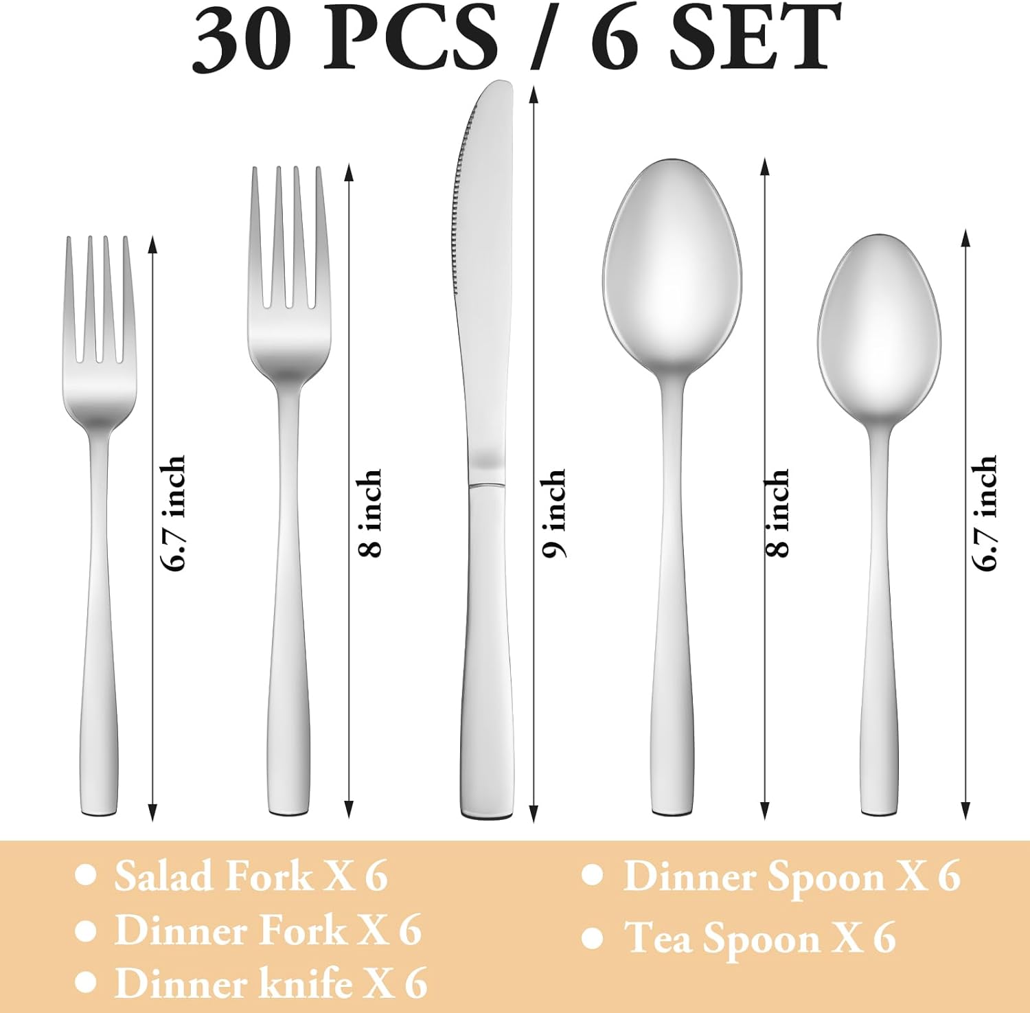 - 30 PCS SILVERWARE SET SERVICE FOR 6: This silverware set comes with 6 Dinner Forks, 6 Dinner Spoons, 6 Dinner Knife, 6 Salad/Dessert Fork and 6 Dessert/Tea Spoons, essential for families or restaurants. The set is also an irreplaceable dining tool whether it is for daily use or for preparing dinners or parties.
