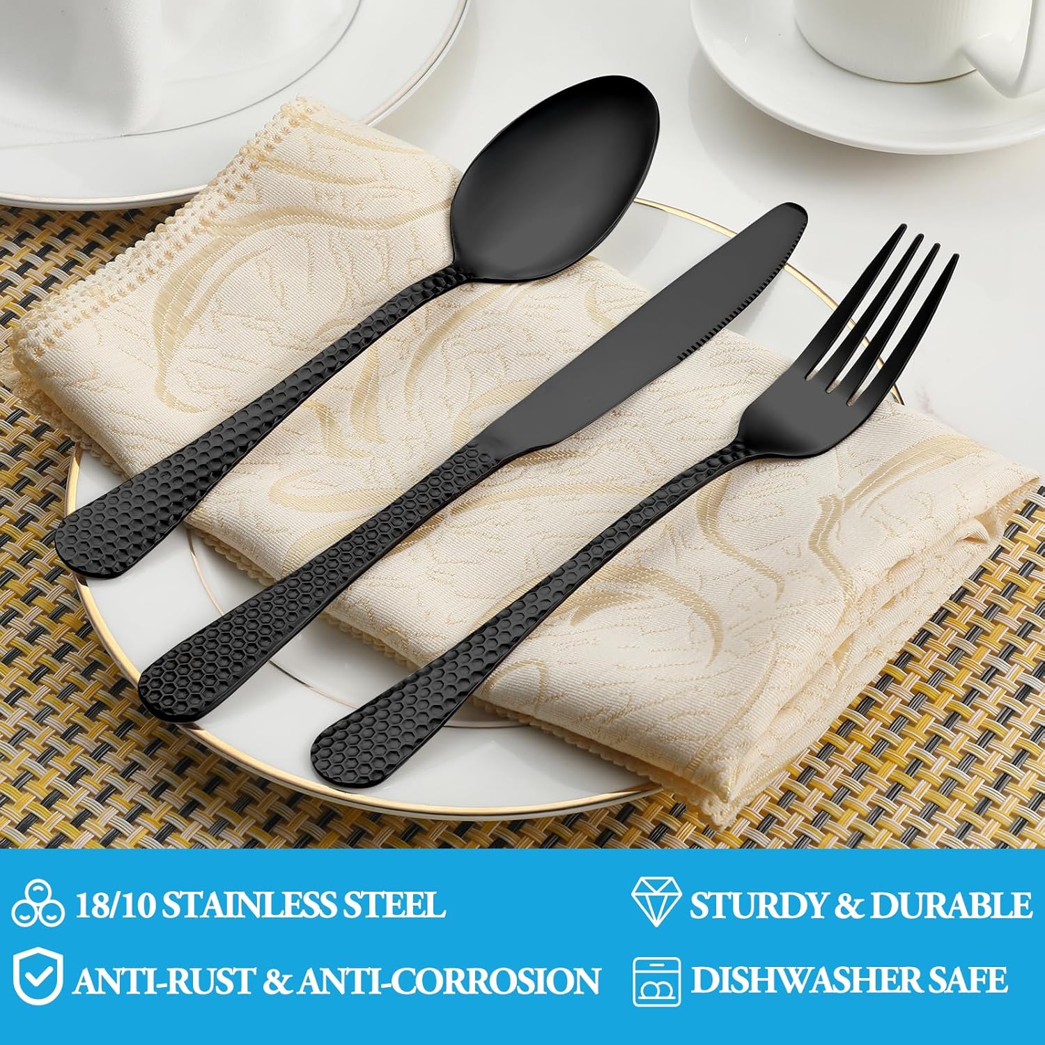 - PREMIUM STAINLESS STEEL: This black hammered flatware set is made of high quality food grade stainless steel which is very durable, rust-proof, corrosion resistant, non-toxic, BPA free, no metal aftertaste. Meanwhile, its sturdiness ensures that it will not bend easily providing you with long - term use. Most importantly, theyโre dishwasher safe.