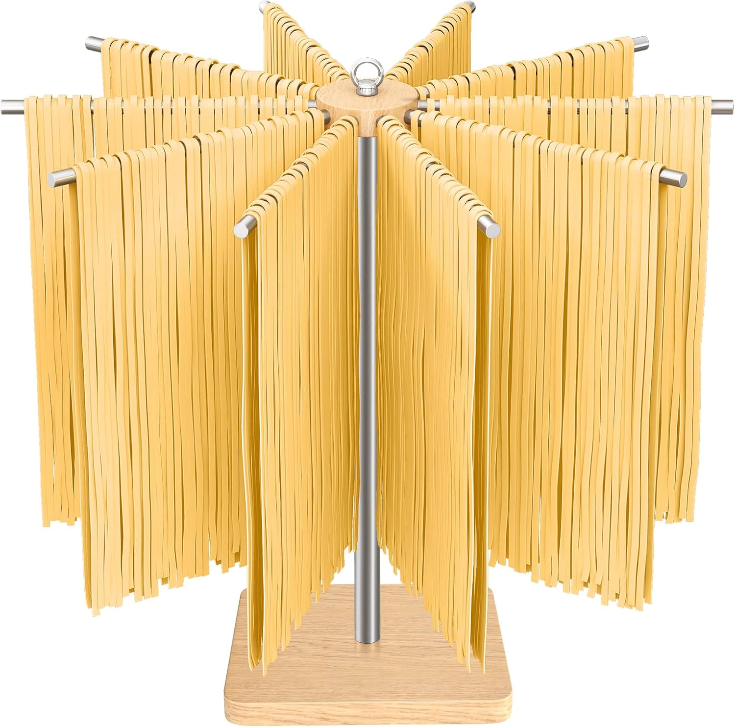 - γNOTE: The pasta drying rack comes with two different base designs: Square or Round. They will be shipped randomly.γWell Constructed. Made of 304 stainless steel and a thick natural wood base, the pasta drying rack won't tip over easily when trying to load pasta on. Brushed finish keeps pasta from sticking to the bar and is easy to clean.