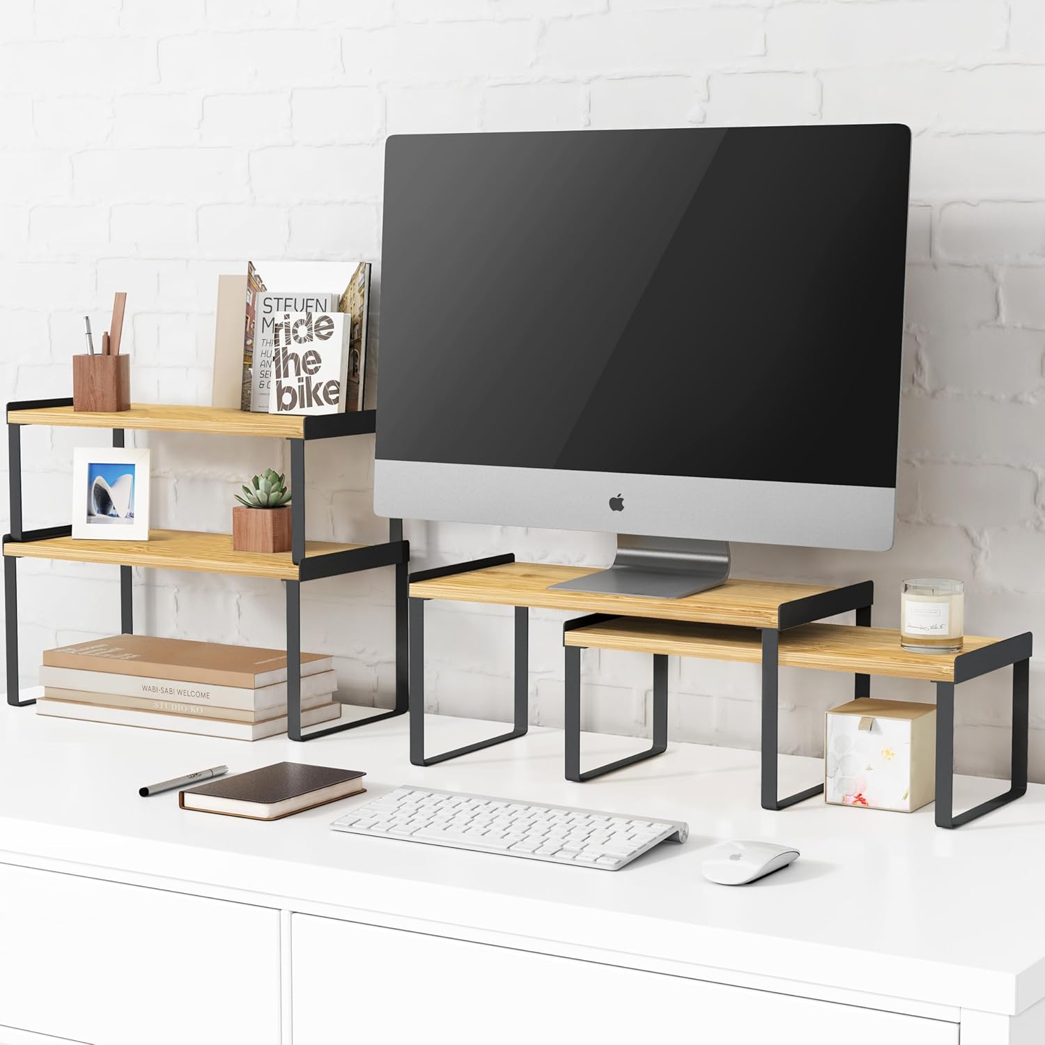 - 【Stylish Design & Premium Material】The unique design of desk shelf organizer with lip on the left & right sides make it more available storage space and also prevents objects from falling. The cabinet storage shelves are made of high-quality natural painted bamboo wood and durable black metal frames. Goozii Kitchen shelf organizer is sturdy and can bear up to 30 pounds.