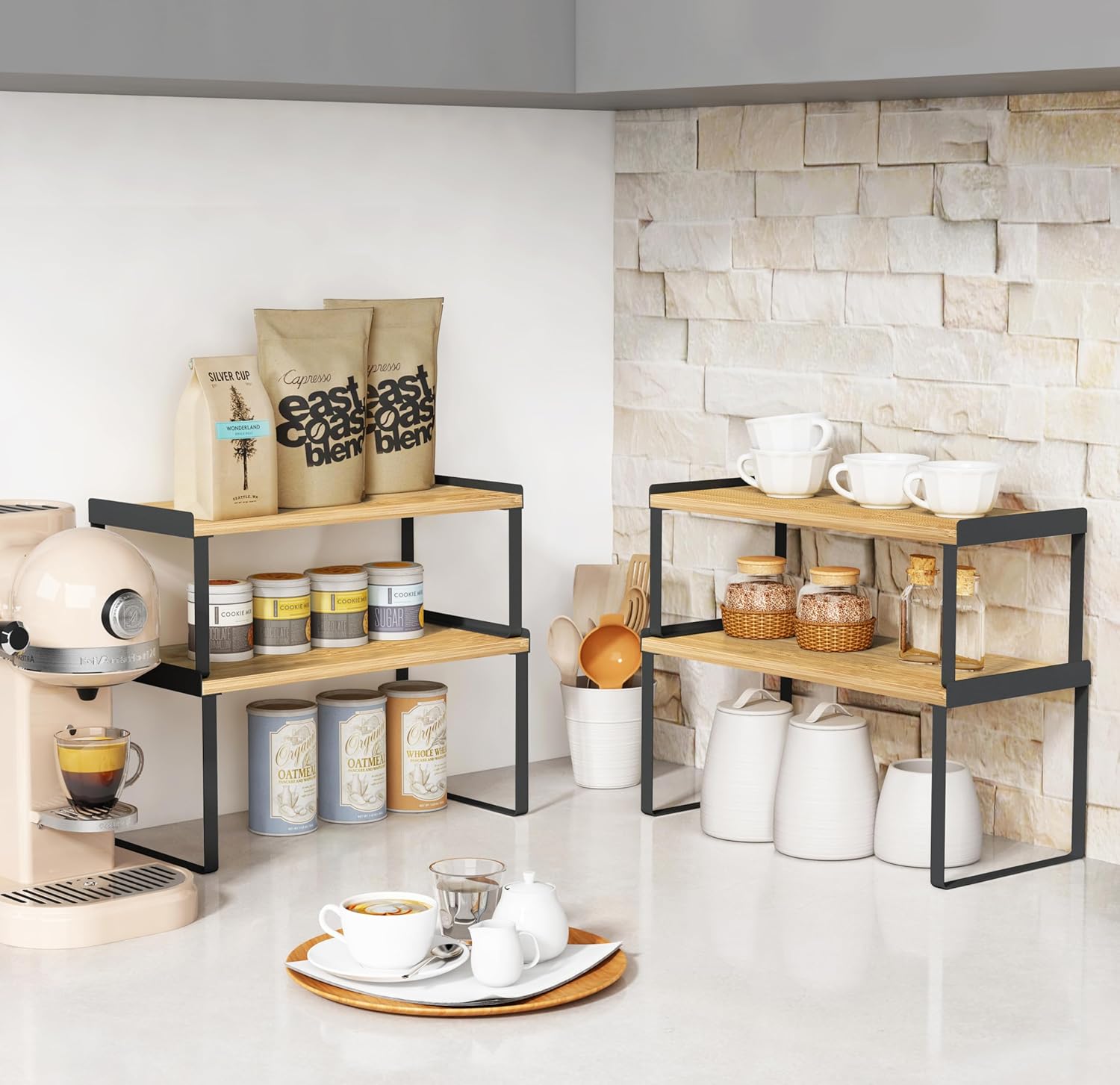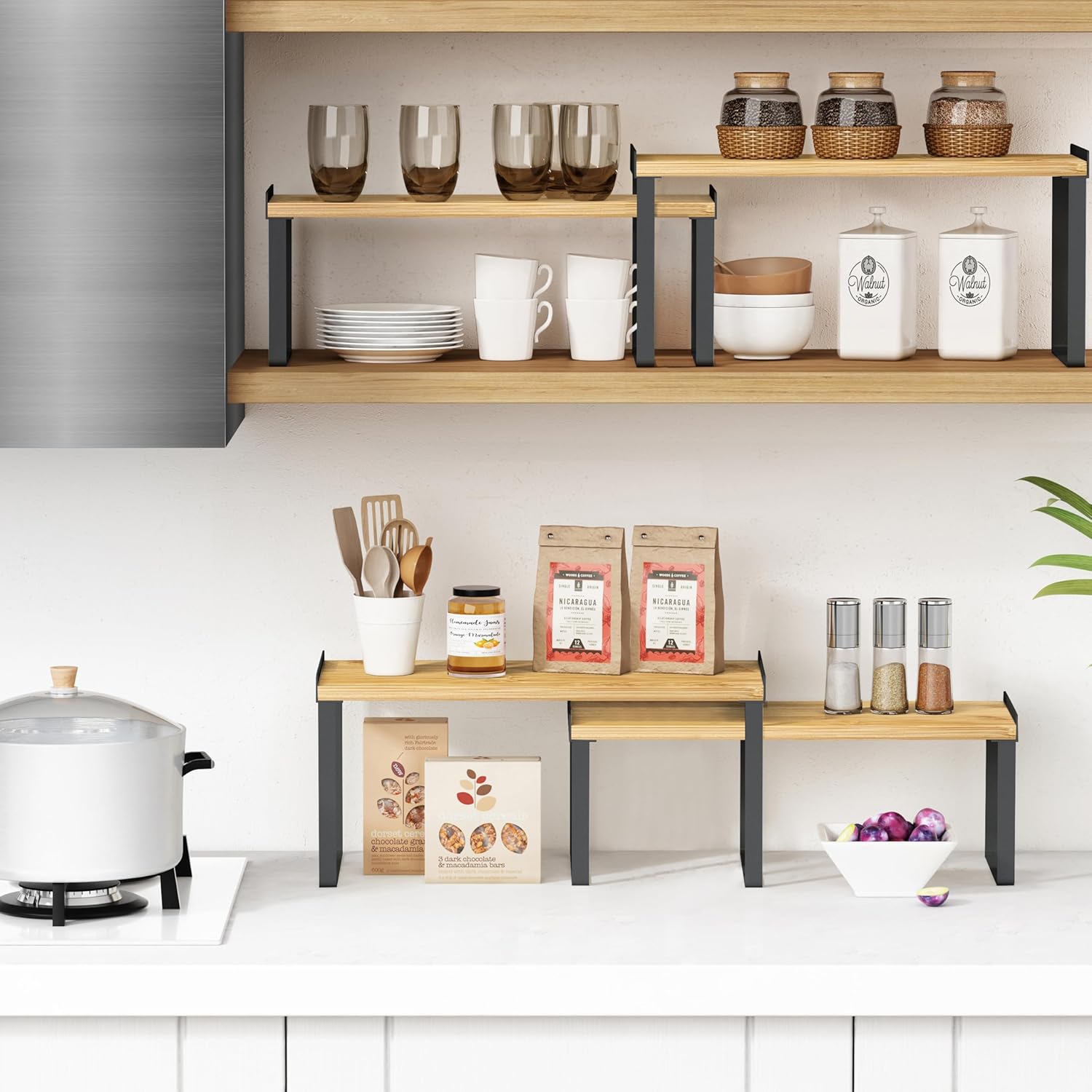 - 【Versatile Shelf Riser Organizer】This cabinet shelf organizers are useful kitchen organization and storage tools to organizer messy items in your cabinet, pantry, cupboard, kitchen counter corner, coffee bar, etc. The shelf organizer can also be used outside the kitchen, as table shelf stand for your monitor on home office and so on.