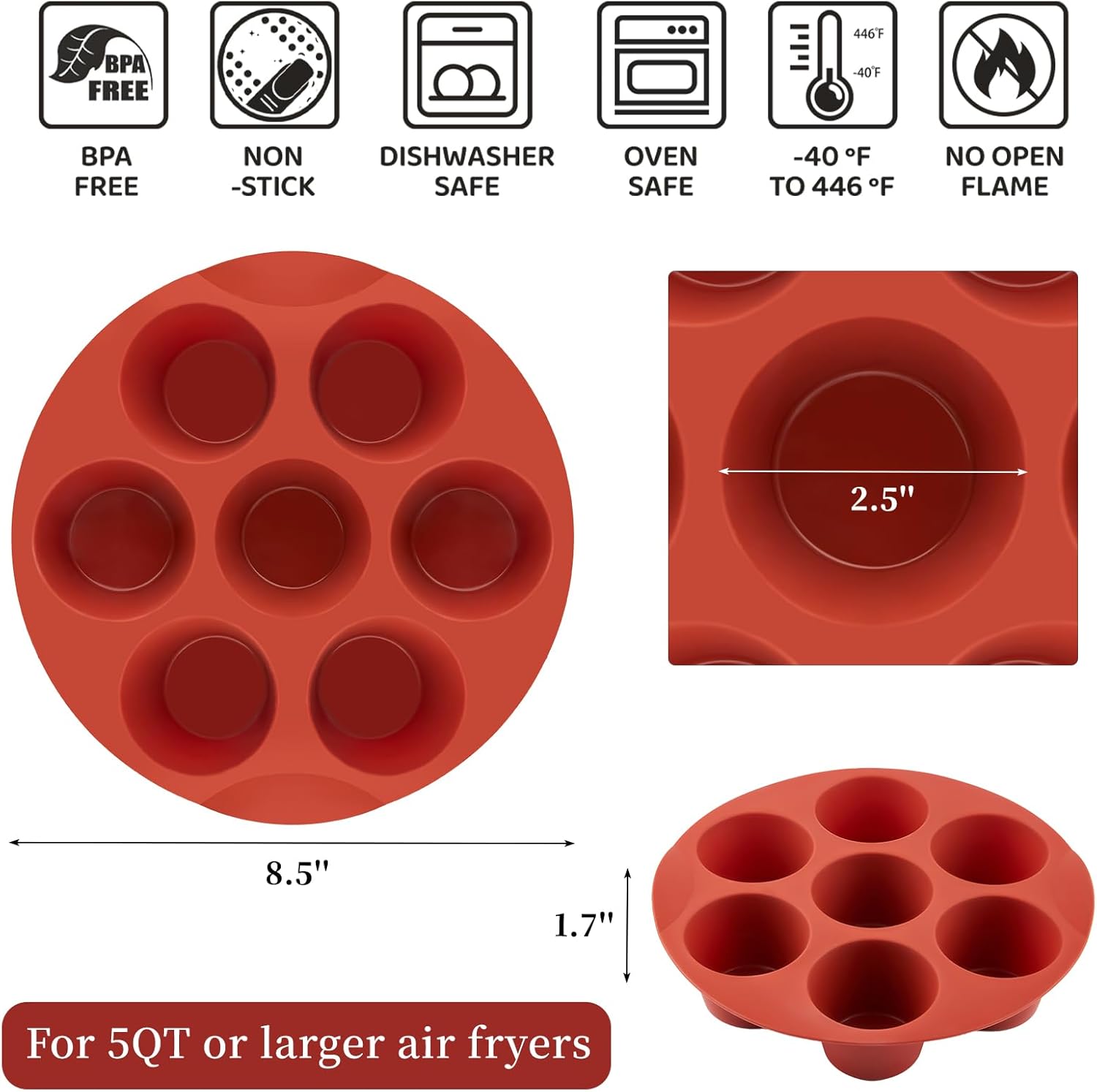 - Fit Size: The cupcake pans are 8.5 inches in diameter and suitable for 5 quart or larger air fryers. Each cup measures 2.5 inches in diameter and 1.7 inches in height.