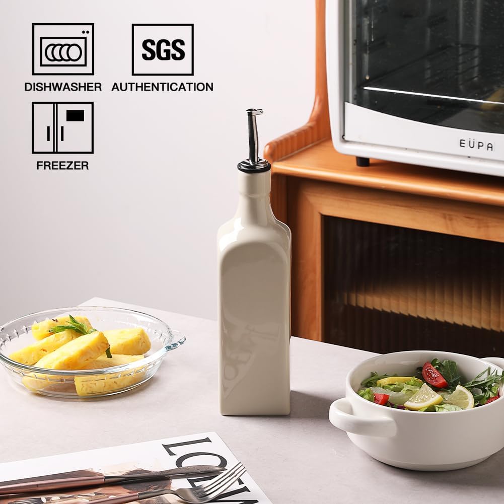 - Leak Proof & Keep Liquid Fresh - The bottle is made of durable ceramic that creates a smooth glaze. Designed with a spout makes it easy to open and close the vinegar bottle for extended shelf life of liquid. And the opaque porcelain bottle protects the oil from light and makes it last longer.