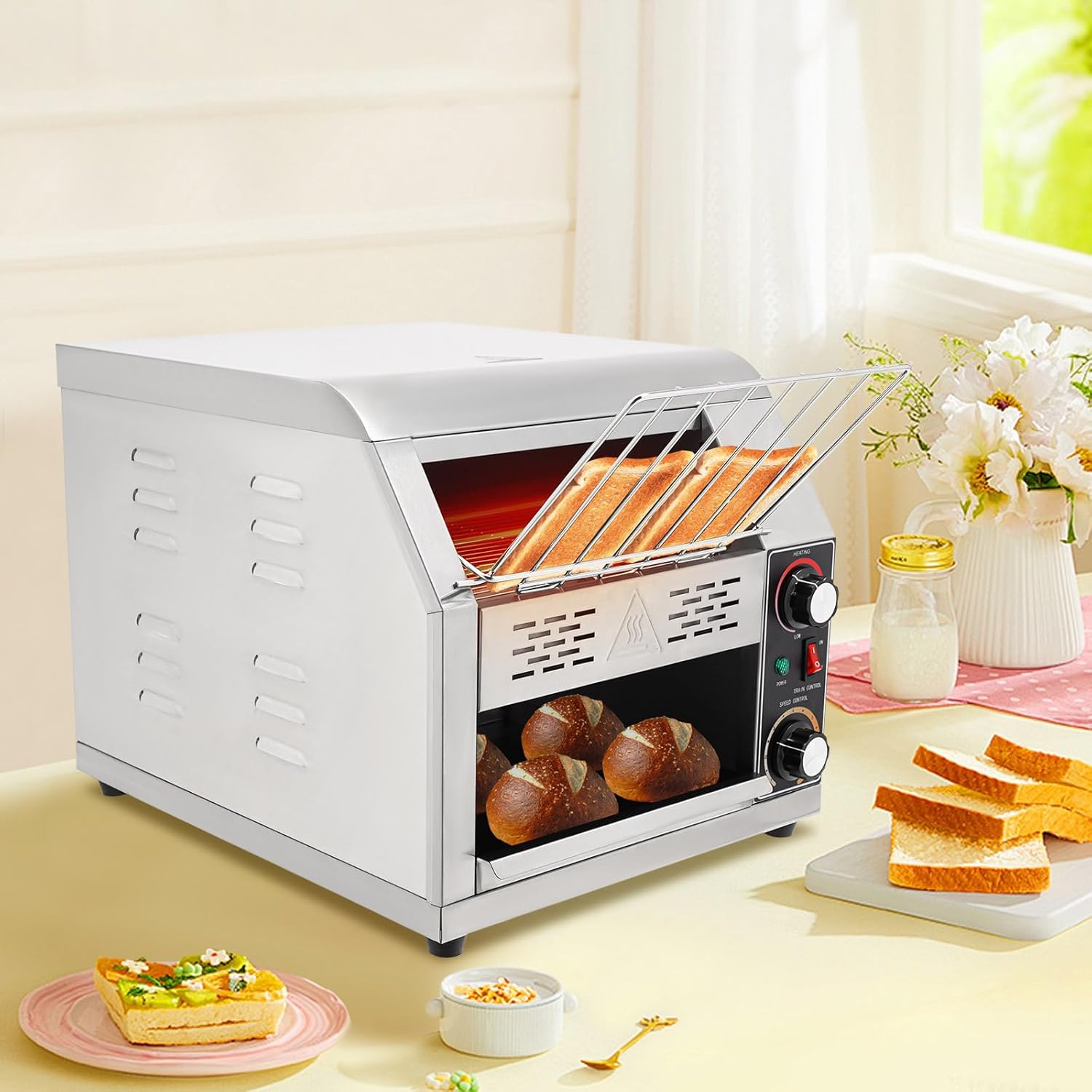 - HIGH QUALITY: Made of high quality food-grade 201 stainless steel, this toaster looks elegant and guarantees a long service life. With high efficiency heating tube, both sides are evenly toasted at the same time, which is a good assistant for making crispy and delicious toast slices. The chain type automatic conveyor belt can smoothly transfer the toasted food and ensure the continuity of toast delivery, thus greatly improving the working efficiency.