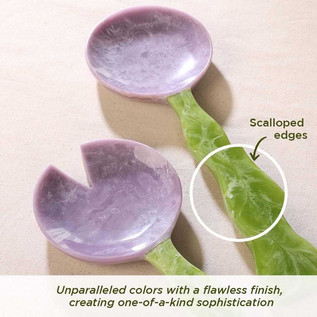 - [HANDCRAFTED FROM RESIN] - Our spatula tongs sets feature elegant scalloped edges and a sleek, modern look that enhances any kitchen, salad bowl or dining decor. Each set in the aesthetic kitchen essentials is uniquely crafted, showcasing distinct patterns and characteristics, ensuring a one-of-a-kind piece.