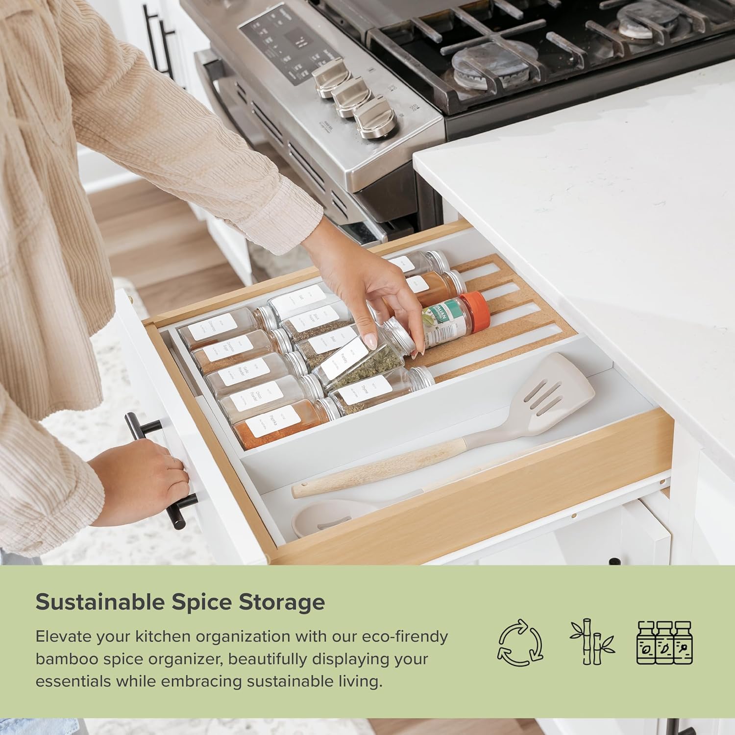 KitchenEdge Spice Drawer Organizer with Expandable Storage. Holds up to 15 Spice Jars (Not Included), Non-Slip Feet, Kitchen Accessory Storage, 100% Sustainable Bamboo Wood (White Bamboo)