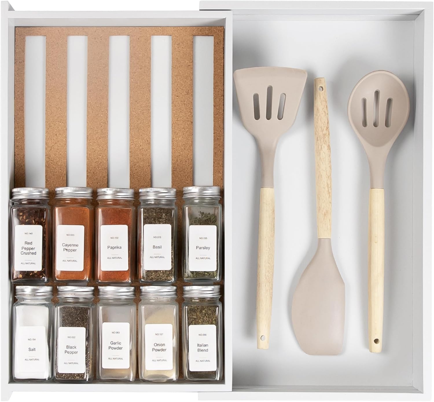 - STREAMLINED DRAWER STORAGE: Efficiently organize your kitchen with a versatile spice or vitamin drawer organizer. Its non-slip cork base ensures stability, preventing items from shifting. With expandable compartments catering to utensils or larger spice containers, this organizer adapts to your needs, maximizing both space and functionality in your kitchen drawers.