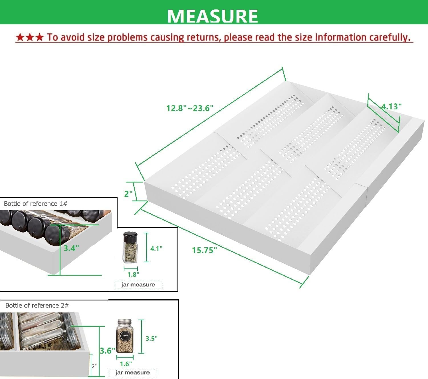 - ⭐【Expandable Spice Drawer Insert】Expandable width:12.8"W~23.6"W,suitable for most drawers,just need place the inserts in your drawer and adjust it to the desired size.With using the slanted levels spice drawer, the bottles will become clear at a glance, which is convenient for you to quickly select what you need.