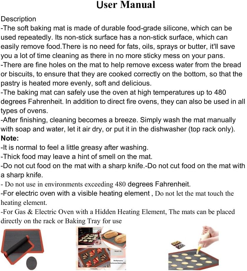 - The baking mat is made of food grade silicone and fiberglass, and the heat can be evenly distributed across the smooth surface of the mat, helping to prevent scorching on the edges and bottom, providing you with better tasting food.