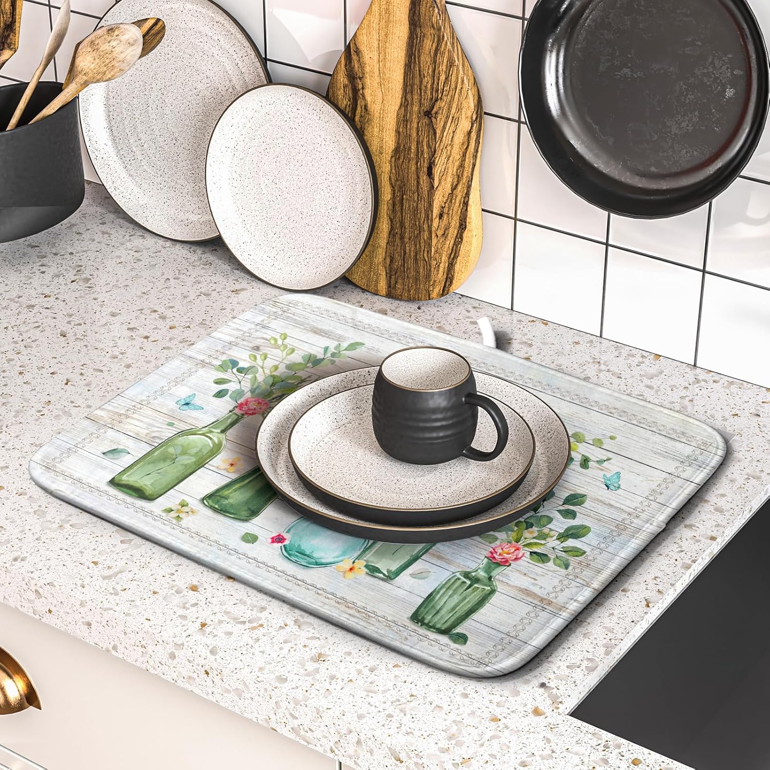 Fern Leaf Vase Dish Drying Mat 16x18 Inch Eucalyptus Leaves Microfiber Absorbent Dish Drainer Mat Reversible Drying Pad for Kitchen Counter Sink
