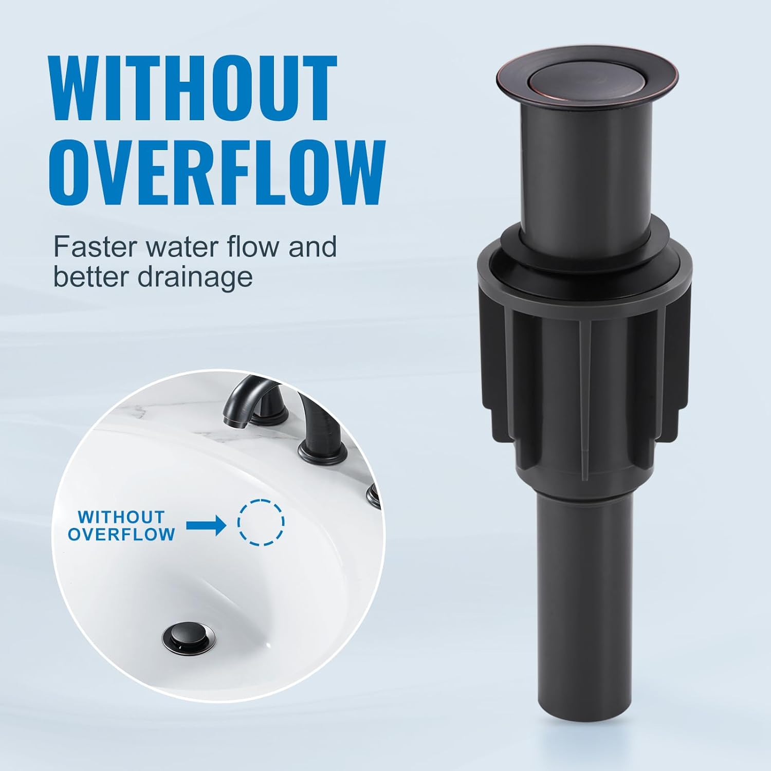 - 【Without Overflow】- This pop up drain stopper assembly works with vessel, basin, and above Counter bathroom sinks without Overflow and allows for faster drainage.
