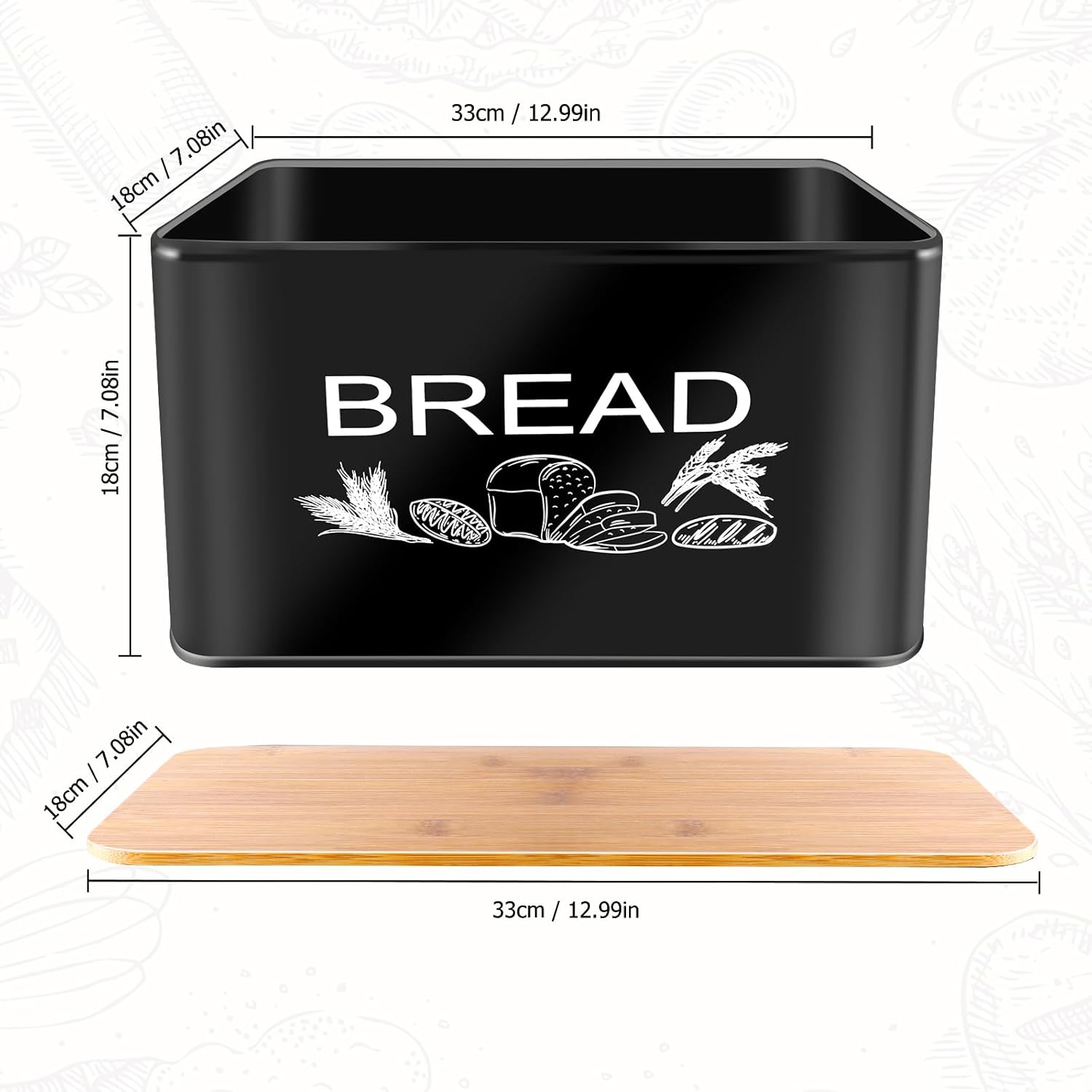 - 【Large Storage Capacity】: The bread box size is: 33x 18 x 18 cm, can hold 3 loaves of bread, additional space for other muffins, baguettes, rolls and other bread or dry food;