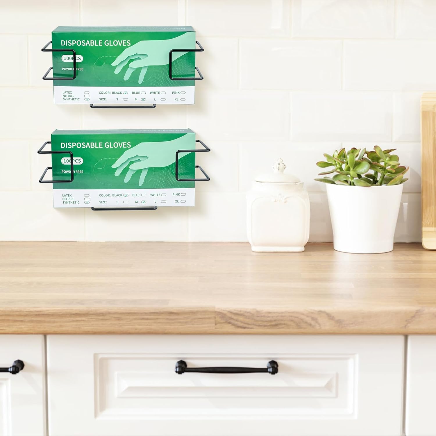 Glove Box Holder 2 Pack, Disposable Glove Dispenser Wall Mount, Metal Glove Rack Organizer for Rubber Latex Gloves Facial Tissue, Black