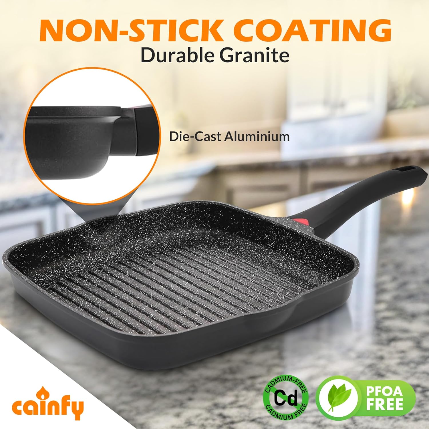 - Versatile Cooking: Discover the ultimate flexibility with our grill pans, ideal for transforming any stovetop into a grilling paradise. This frying pan features a durable granite non-stick coating that is PFOA, lead, and cadmium free for superior release and easy cleanup.
