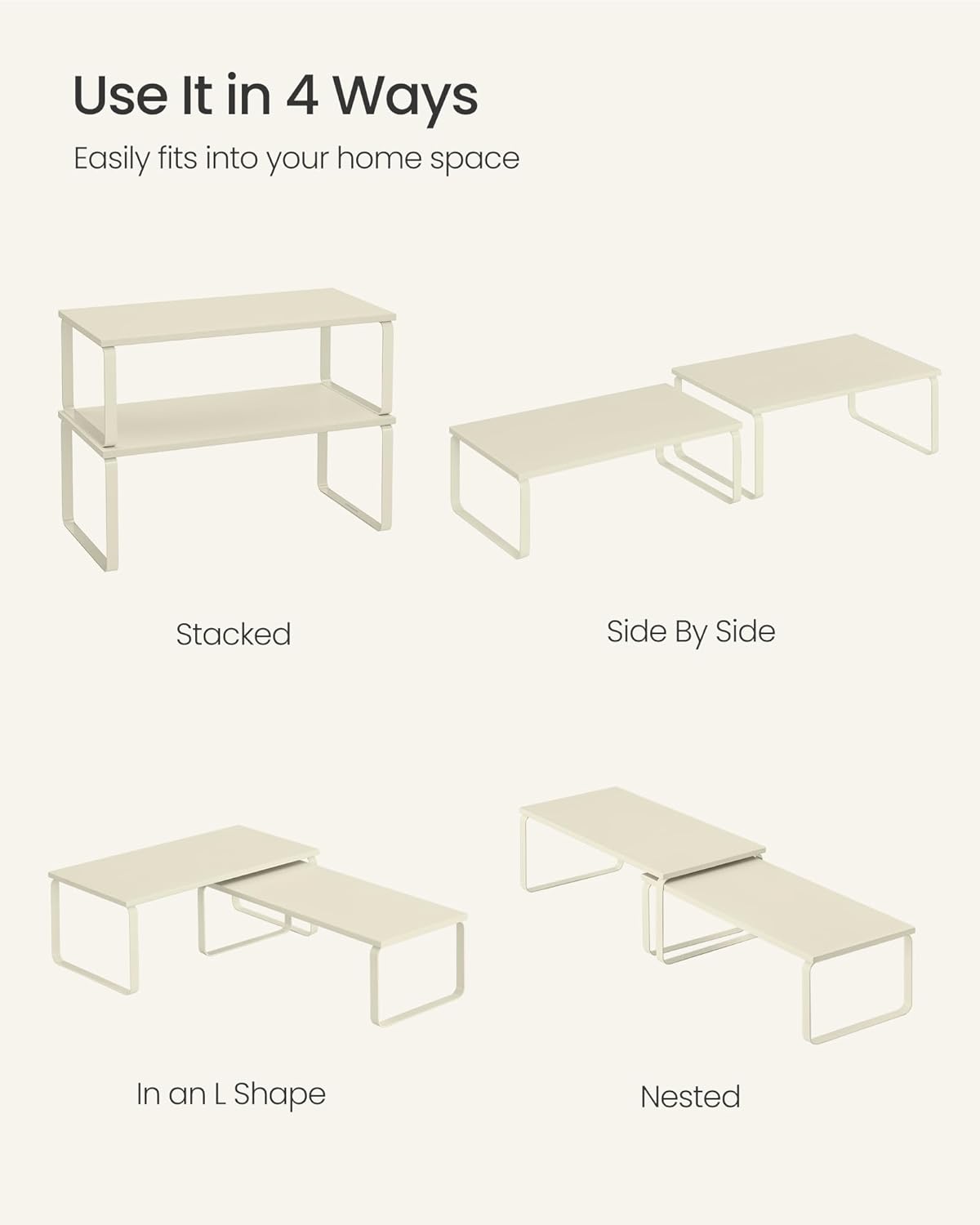 - [Adjustable] With their unique design, with one slightly smaller than the other, these shelf organizers can be stacked on top of one another, nested, used separately, or even in an L-shape. Adjust them how you want to perfectly fit your kitchen space