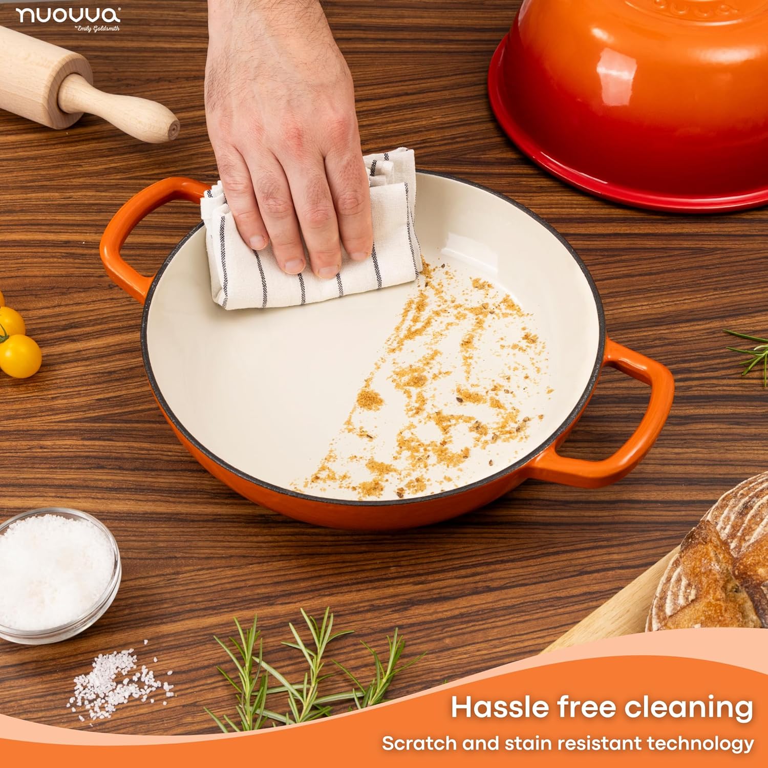 - ENAMELLED FINISH: The enamelled surface of the cast iron dutch oven pot by Nuovva is non-reactive, making it safe for all types of dough and ingredients. It resists rust and scratches, ensuring your pot remains in pristine condition for years. The smooth enamelled finish makes cleaning effortless!
