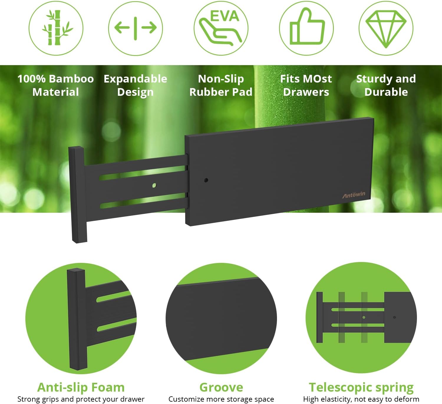 ANTOWIN 4 Pack Expandable Drawer Dividers, 4.7'' High, Extend from 12.2'' to 17.7'', Dresser Drawer Organizers, Bamboo Separators for Kitchen, Bedroom, Office, Bathroom (Black)