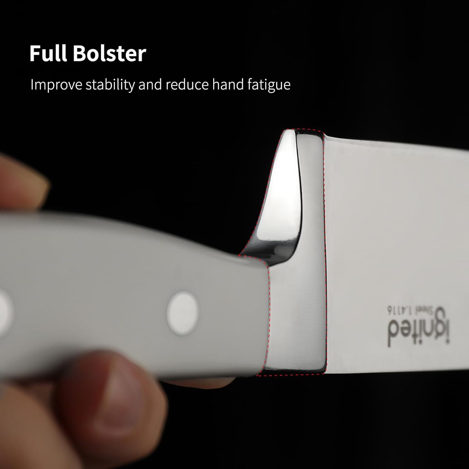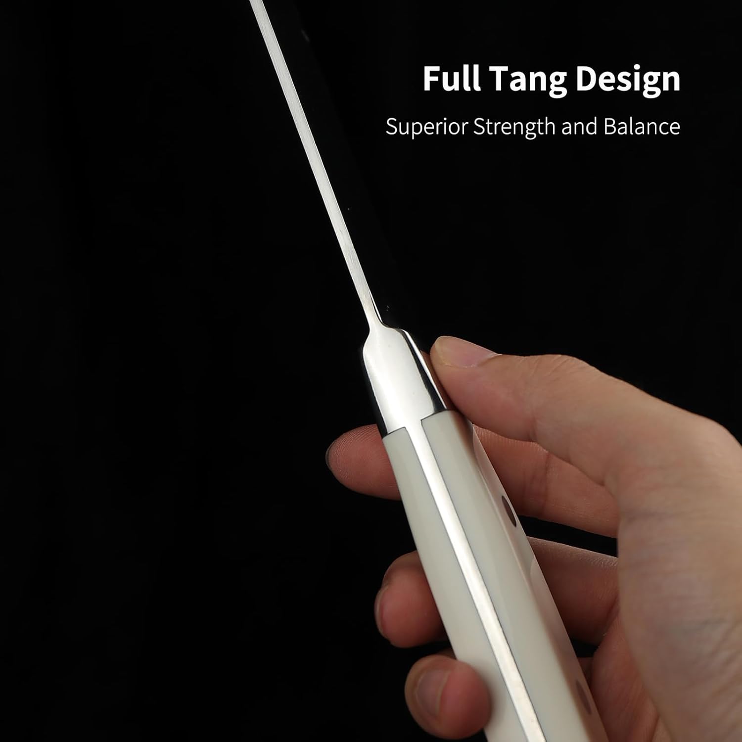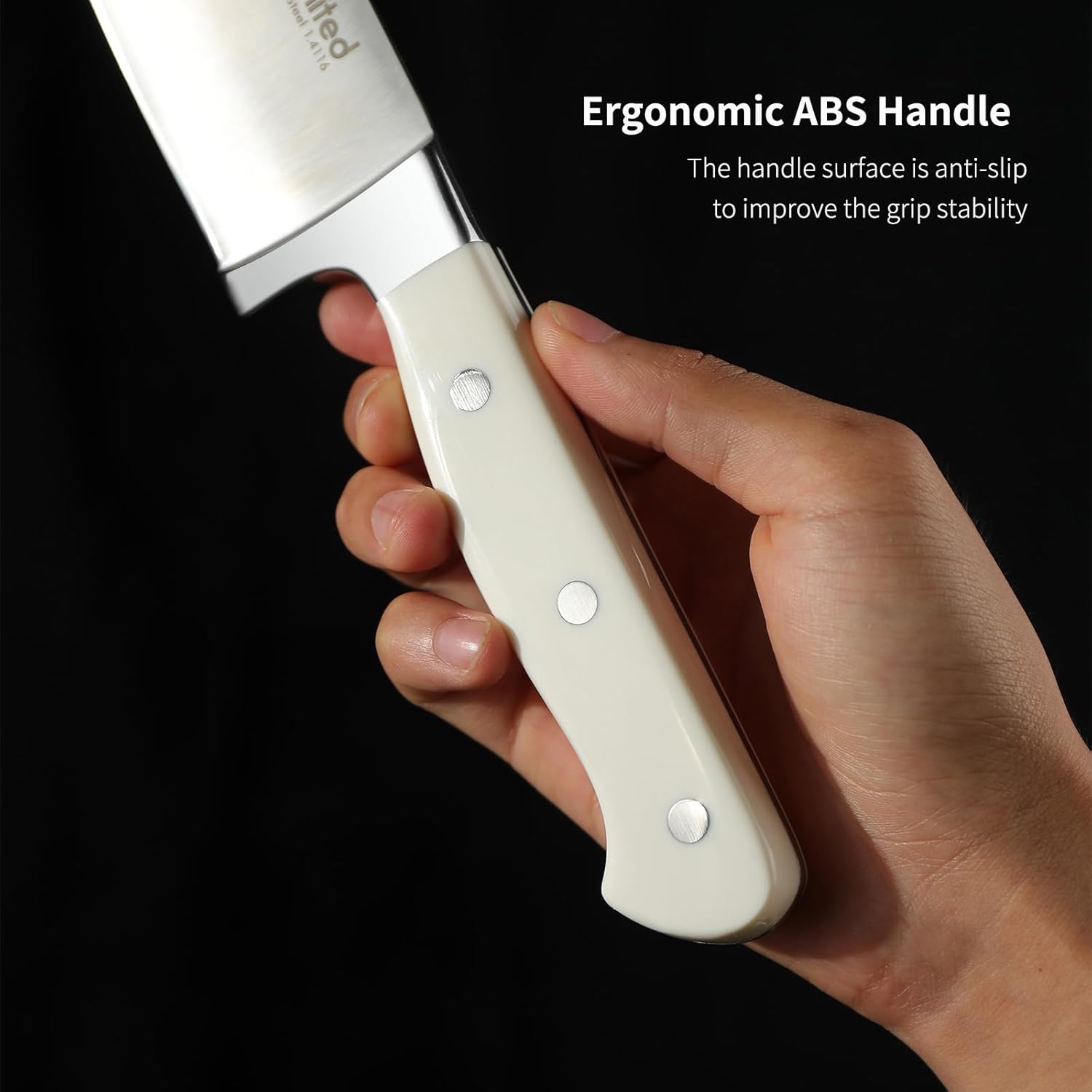 - Pure White Handle - White ABS handle is simple, beautiful and fresh. And it is comfortable to hold and non-slip, easy to wash and clean. Thick and sturdy bolster and finger guards minimize fatigue and avoid damage to fingers. The weighted knife butt keeps the weight well balanced.