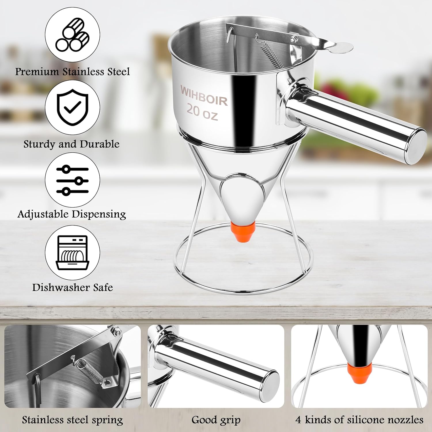 Stainless Steel Pancake Batter Dispenser with Squeeze Handle and Multi-Nozzle, for Pancakes, Cupcakes, and Baked Goods. 20 oz