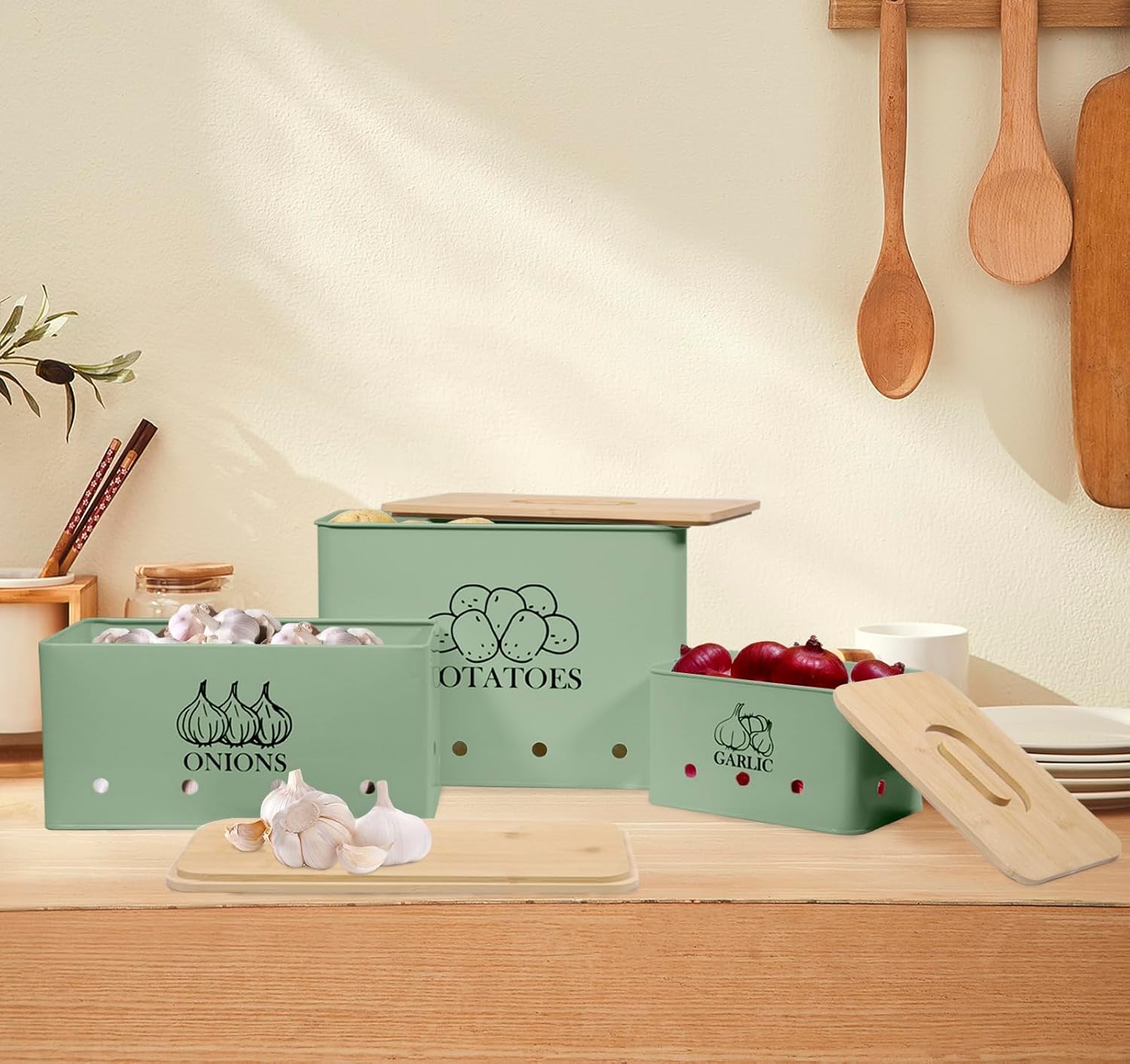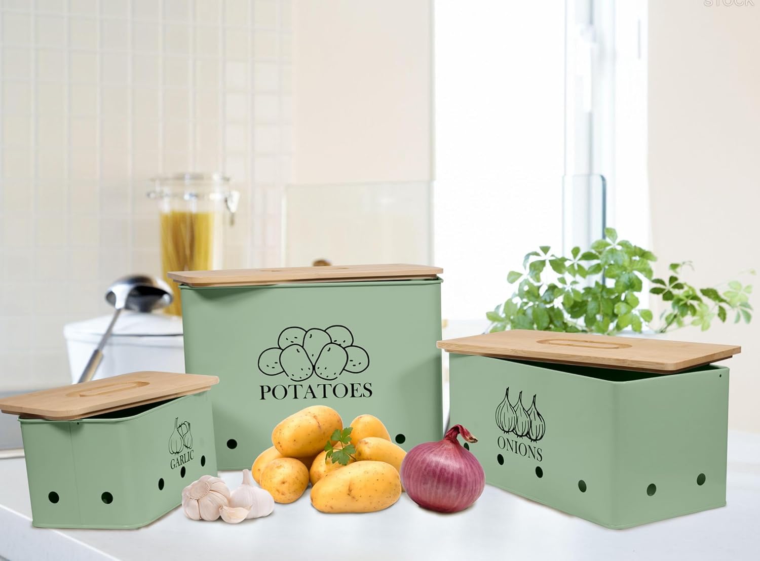 Kitchen Vegetable Storage Tins Set of 3 for Potato Onion & Garlic with Wooden Lid, Kitchen Storage Canisters Set, Long Shelf Life - Green