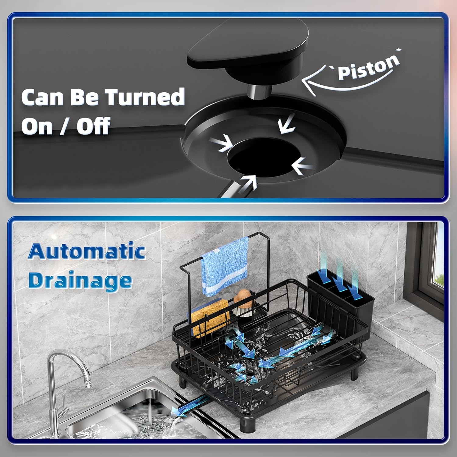 Dish Drying Rack, Compact Dish Racks for Kitchen Counter with Sponge Rack, Space-Saving Dish Drainer Drying Rack with Drainboard, Utensil Holder and and Automatic Drainage Drainboard, Black