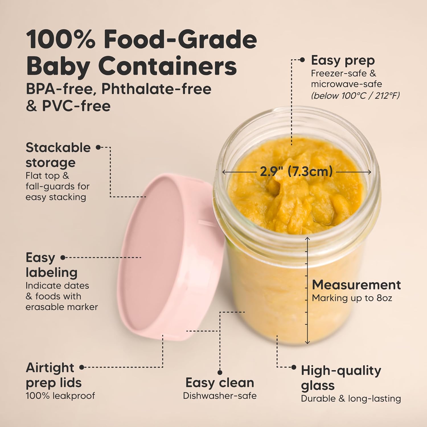 KeaBabies 4pk 8oz Glass Baby Food Containers with Lids - Leak-Proof, Microwavable Small Glass Jars, Baby Purees & Toddler Snack Storage Containers, BPA-Free, Dishwasher & Freezer Safe (Roseate)