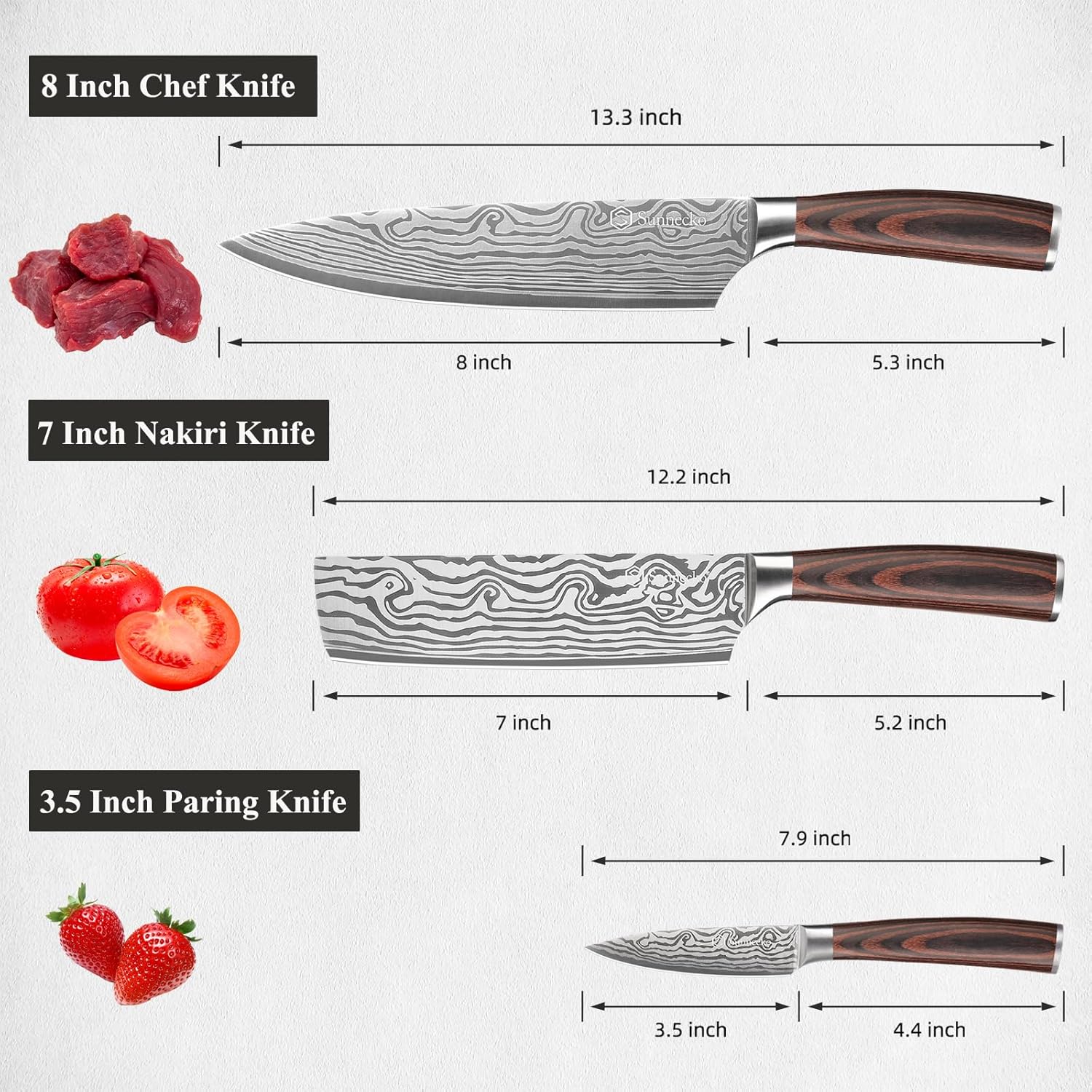 Sunnecko Kitchen Knife Set 3 Piece Chef Knife Set Professional High Carbon Stainless Steel, Sharp Kitchen Knives with Wooden Handle