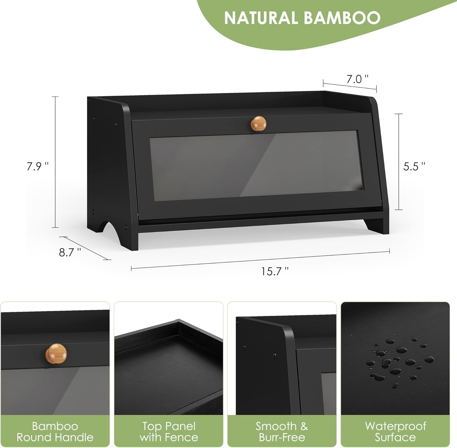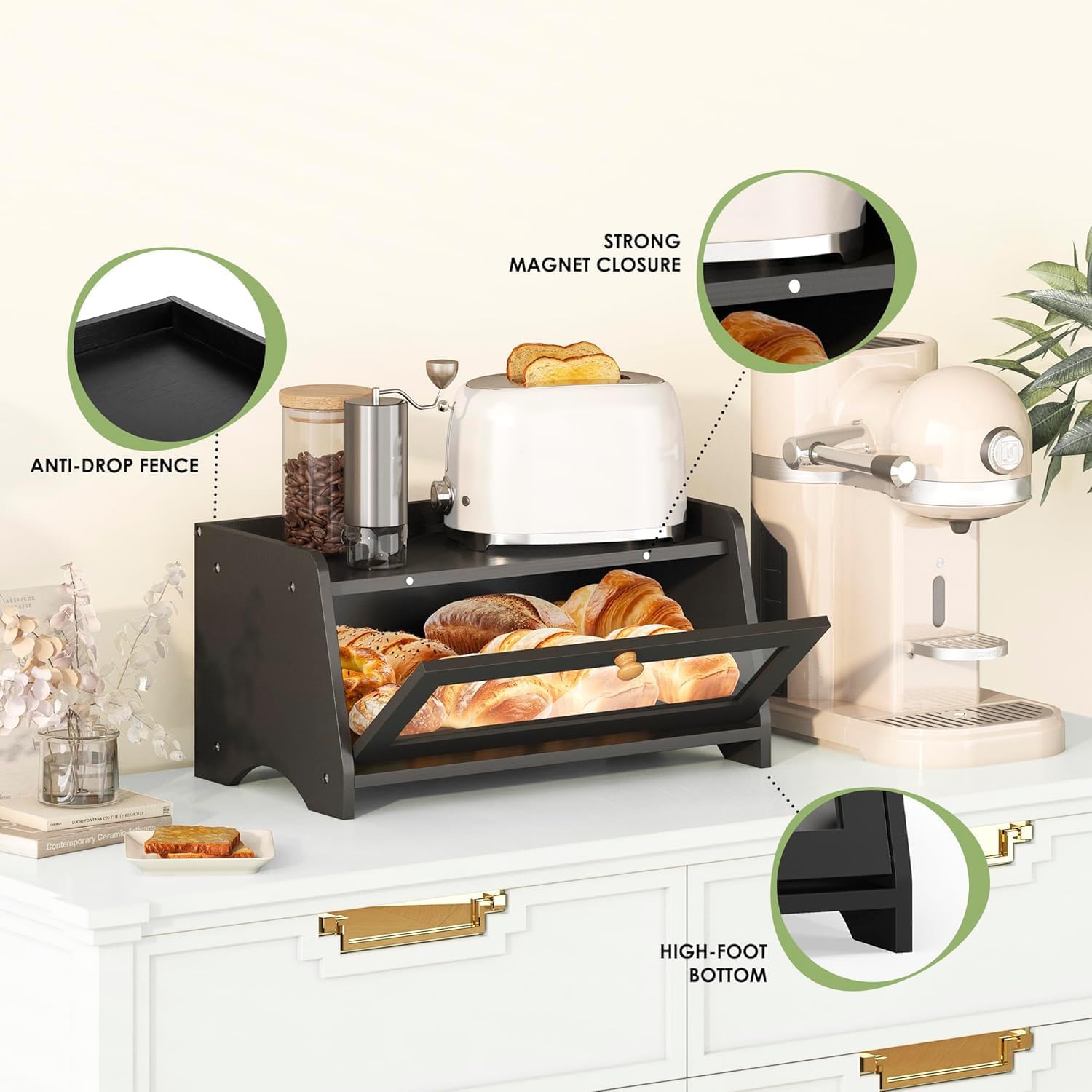 Bread Box for Kitchen Countertop, Large Bread Container Storage, Wooden Farmhouse Bread Box with Window Bread Holder (Black)