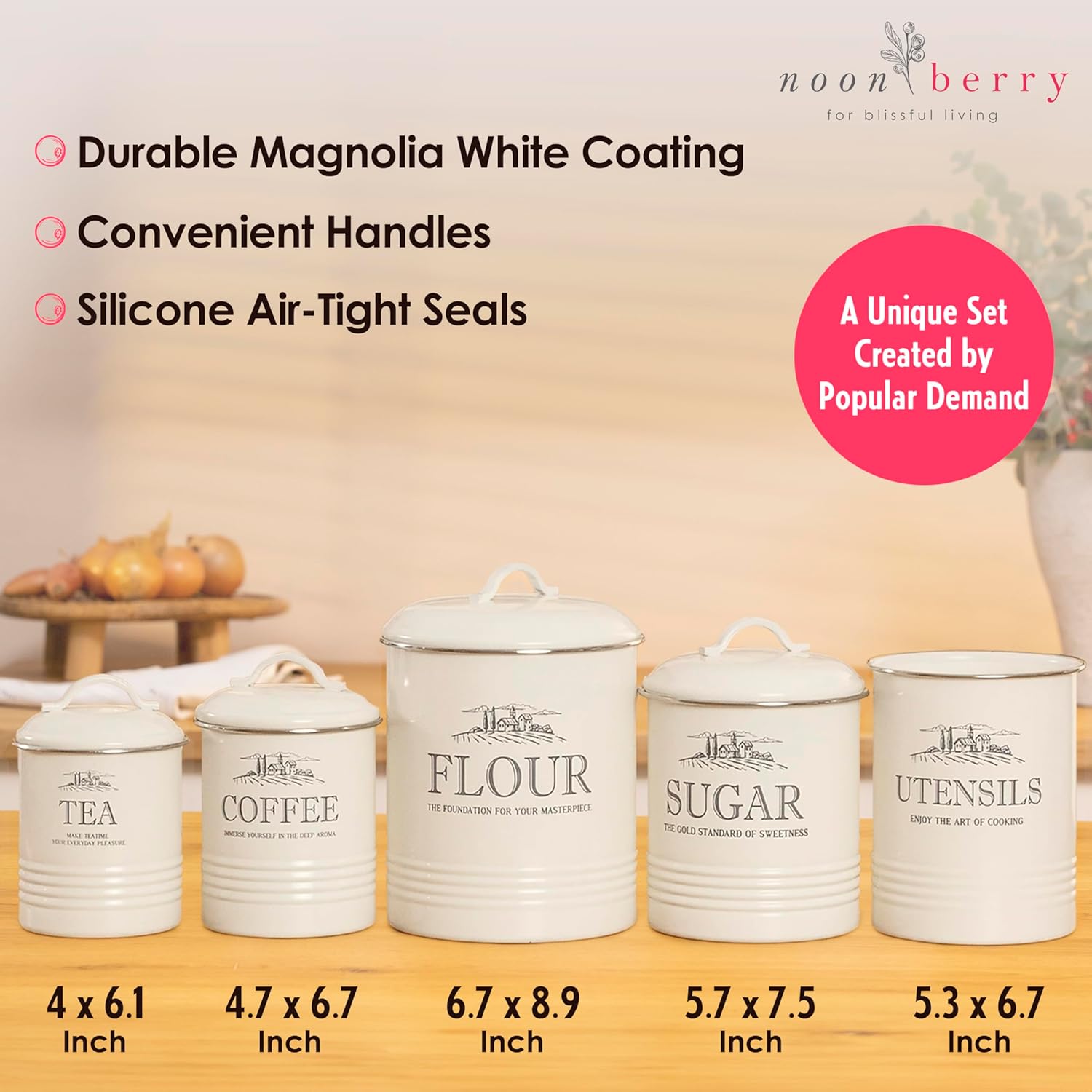 - Unique Set Created by Popular Demand: One-of-a-kind magnolia white canister set of 5 includes Flour (holds up to 14 cups), Sugar (8 cups), Coffee (5 cups), and Tea (up to 3.5 cups) canisters, paired with an optimal-sized cooking utensil holder (5.3 x 6.7 inch) for all your kitchen essentials