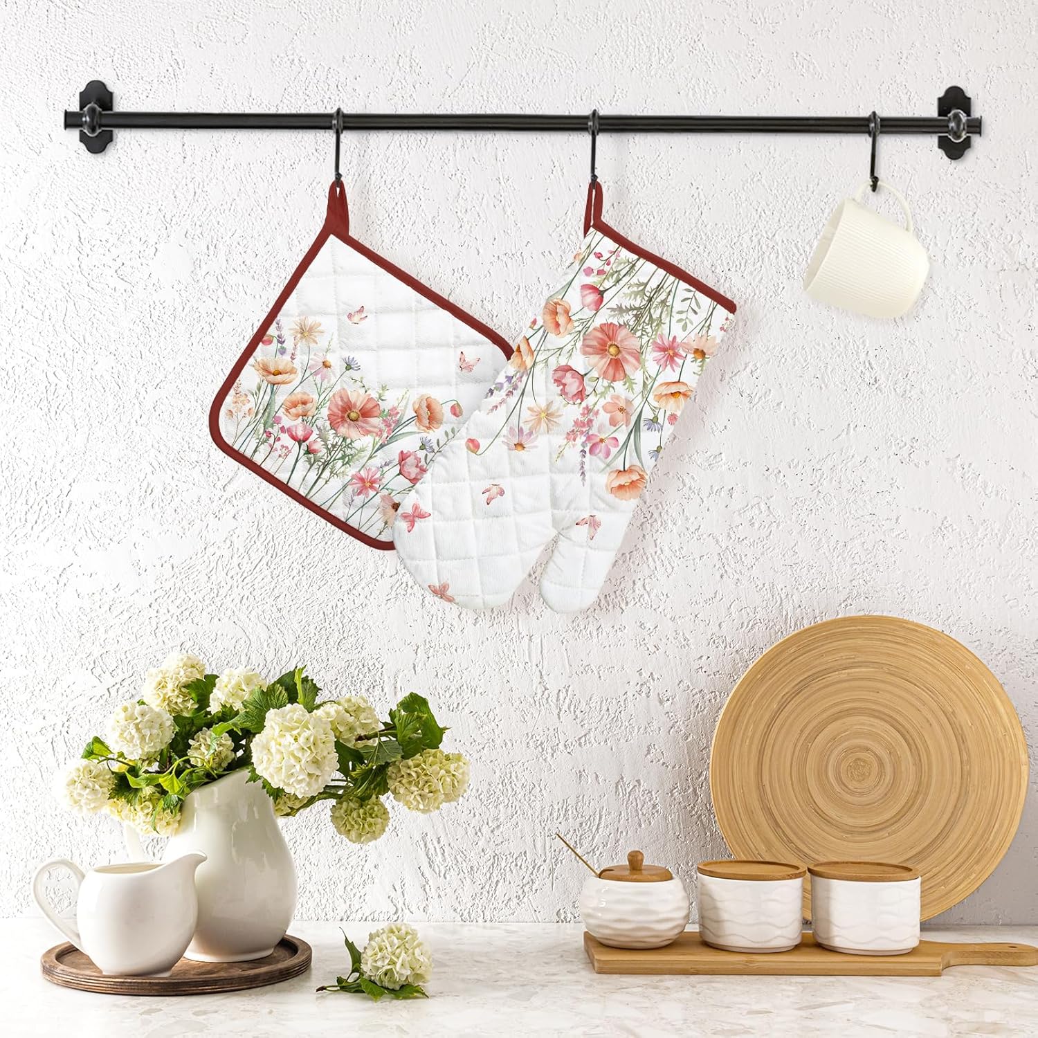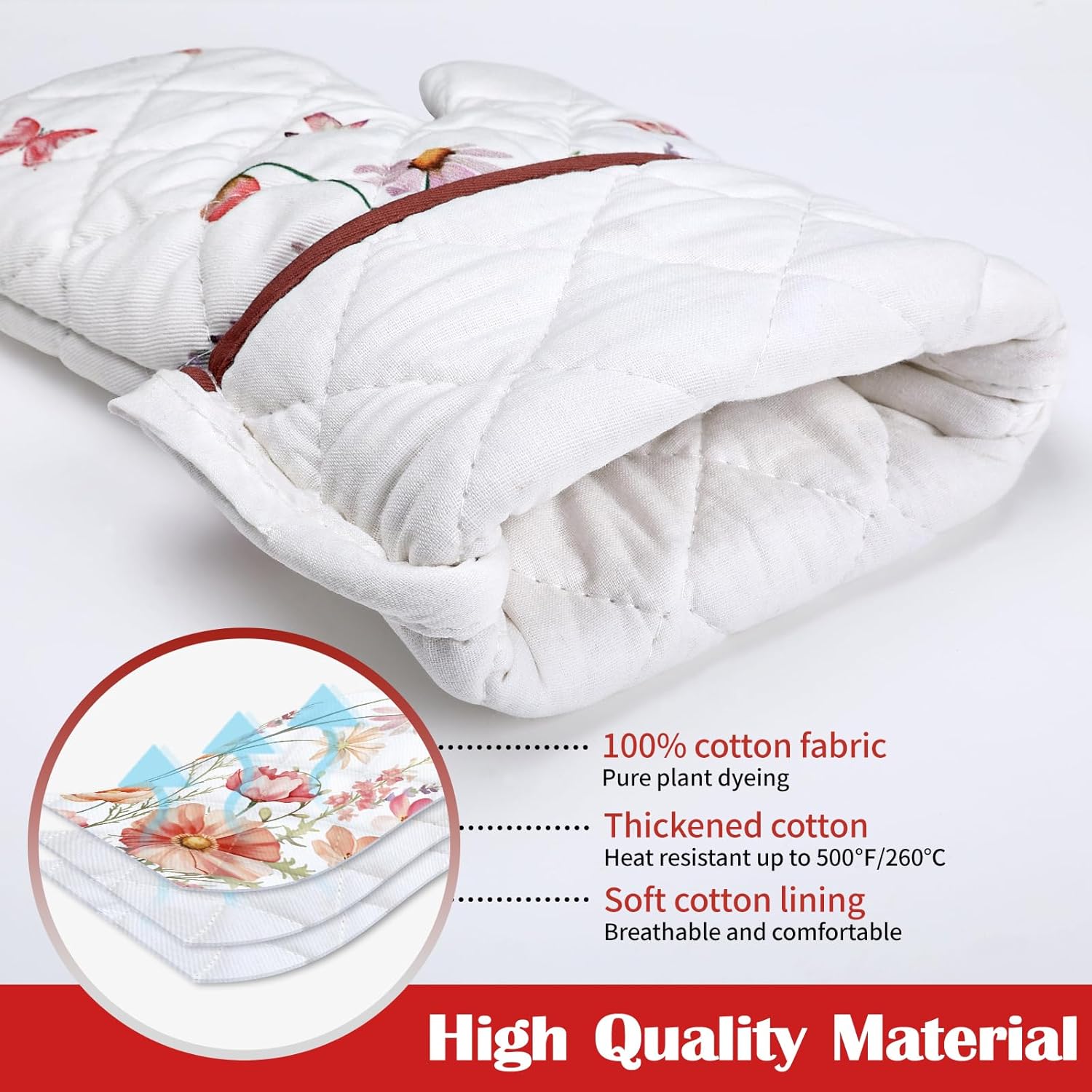 Pink Floral Oven Mitts and Pot Holders Sets 2Pcs, 100% Cotton Heat Resistant, Extra Long Oven Gloves Potholder for Kitchen Cooking Baking Decoration